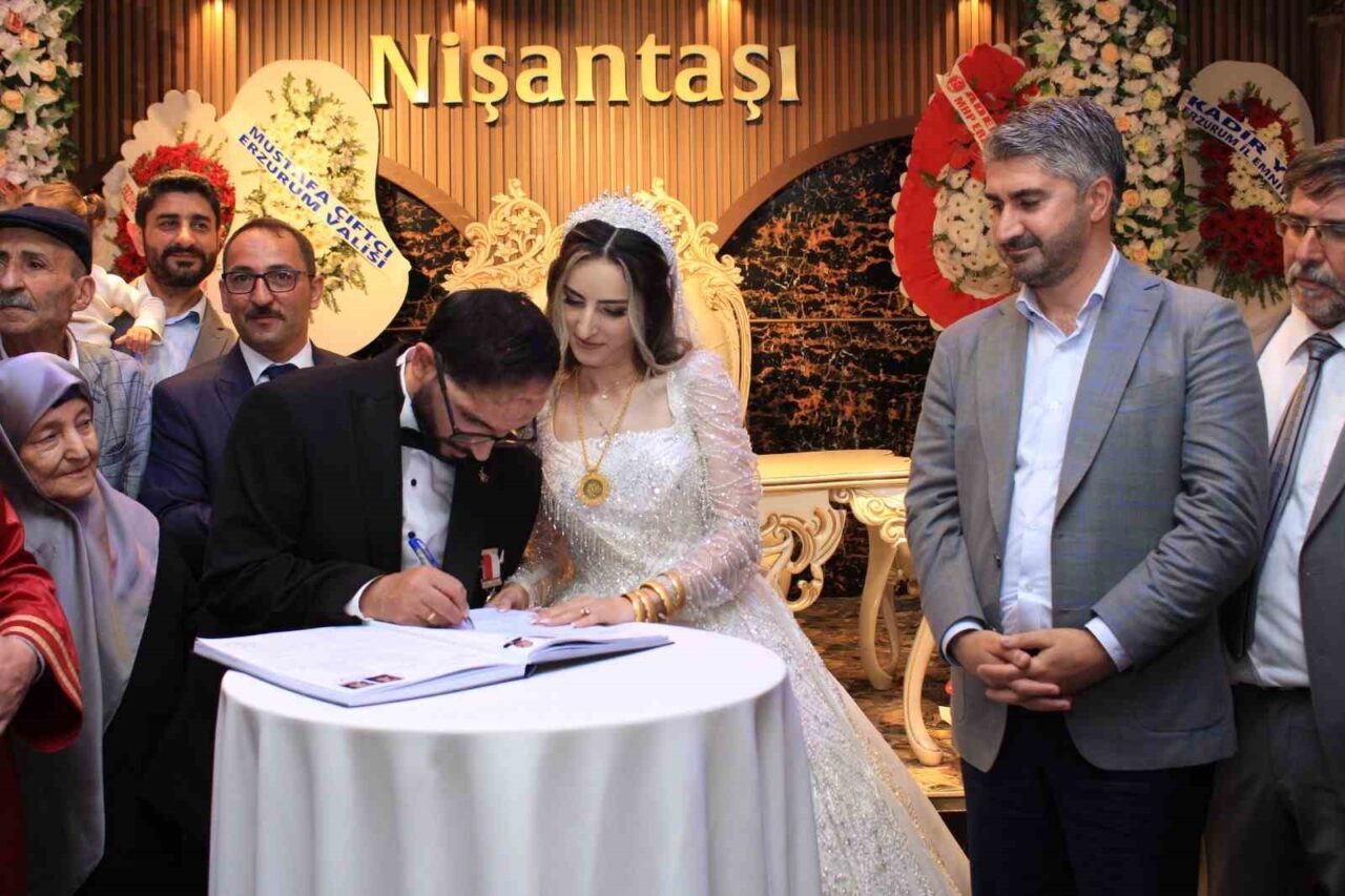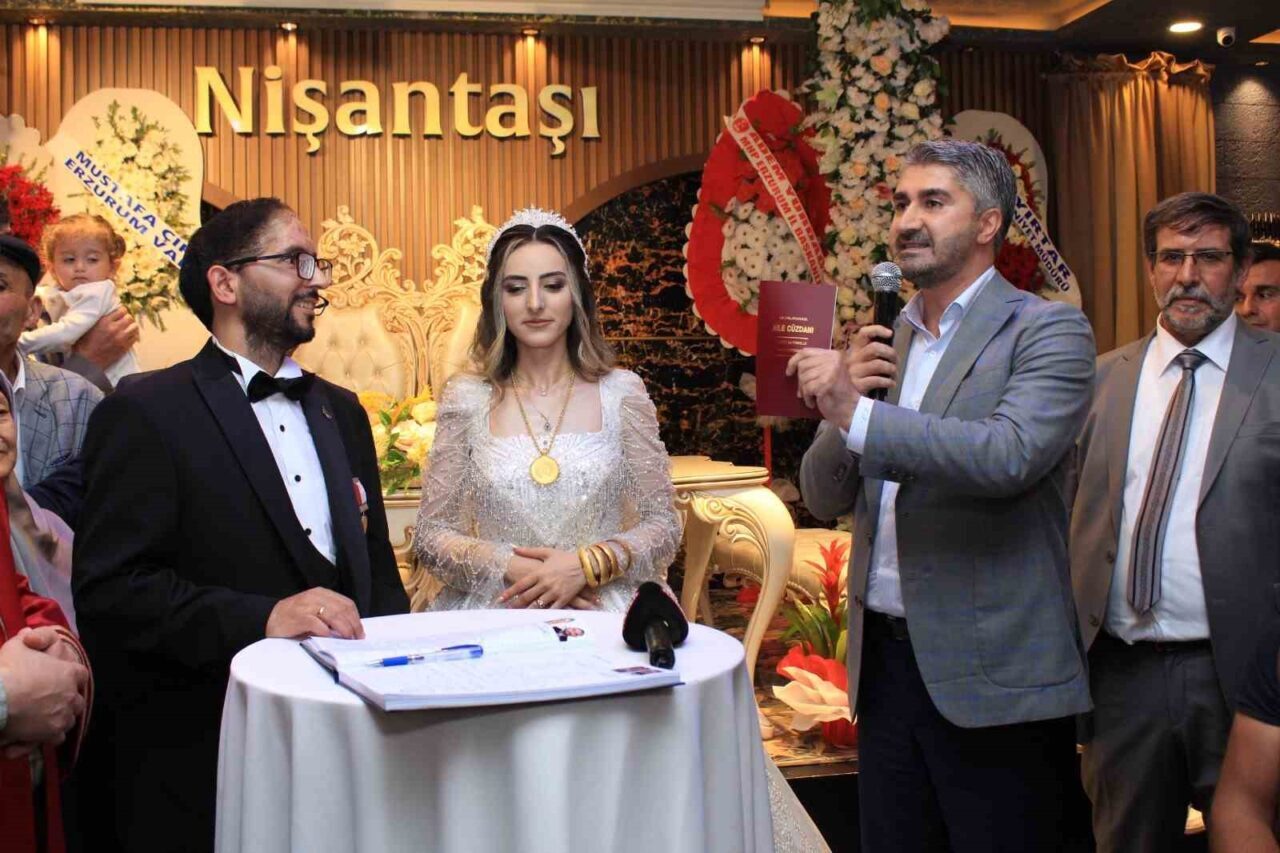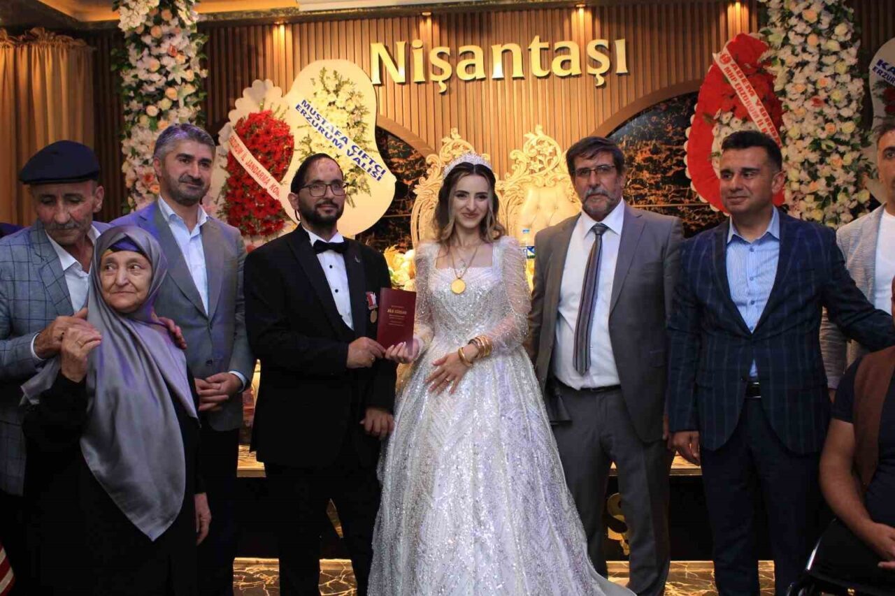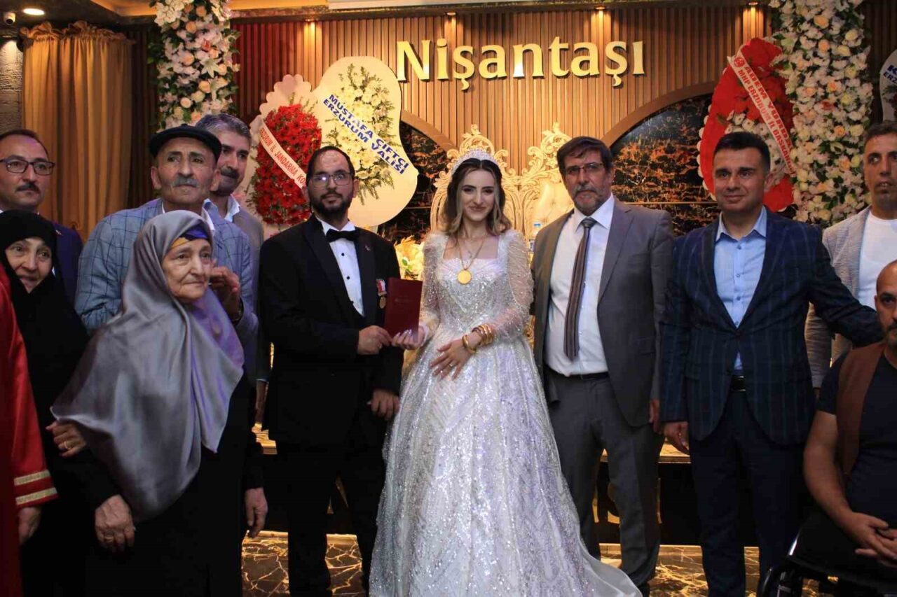 Düğün törenine, damadın silah arkadaşları Ali Kınık’ın “Yalnız Değilsin” şarkısı eşliğinde ellerinde Türk bayrağıyla salona girerek duygusal anlar yaşattı. Nikahı Yakutiye Belediye Başkanı Mahmut Uçar kıyarken; törene Erzurum Vali Yardımcısı Ahmet Özdemir, Aile ve Sosyal Hizmetler İl Müdürü Hasan Aykut, MHP Erzurum İl Başkanı Adem Yurdagül, Türkiye Gazileri ve Şehit Aileleri Vakfı Erzurum Şube Başkanı Rıza Demir ile çok sayıda davetli katıldı.