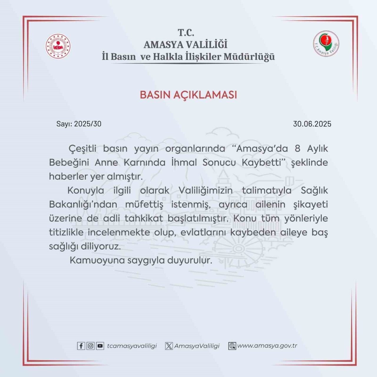 Yapılan açıklamada, “Çeşitli basın yayın organlarında ‘Amasya’da 8 aylık bebeğini anne karnında ihmal sonucu kaybetti’ şeklinde haberler yapılmıştır. Konuyla ilgili olarak valiliğimizin talimatıyla Sağlık Bakanlığı’ndan müfettiş istenmiş ayrıca ailenin şikayeti üzerine de adli tahkikat başlatılmıştır. Konu tüm yönleriyle titizlikle incelenmekte olup evlatlarını kaybeden aileye başsağlığı diliyoruz” ifadelerine yer verildi.