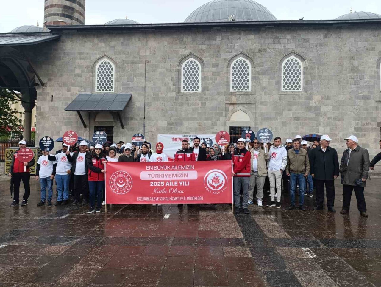 Lalapaşa Camii önünden başlayarak Yakutiye Kent Meydanı’na kadar devam eden yürüyüşte, aile kurumunun önemine dikkat çekildi.