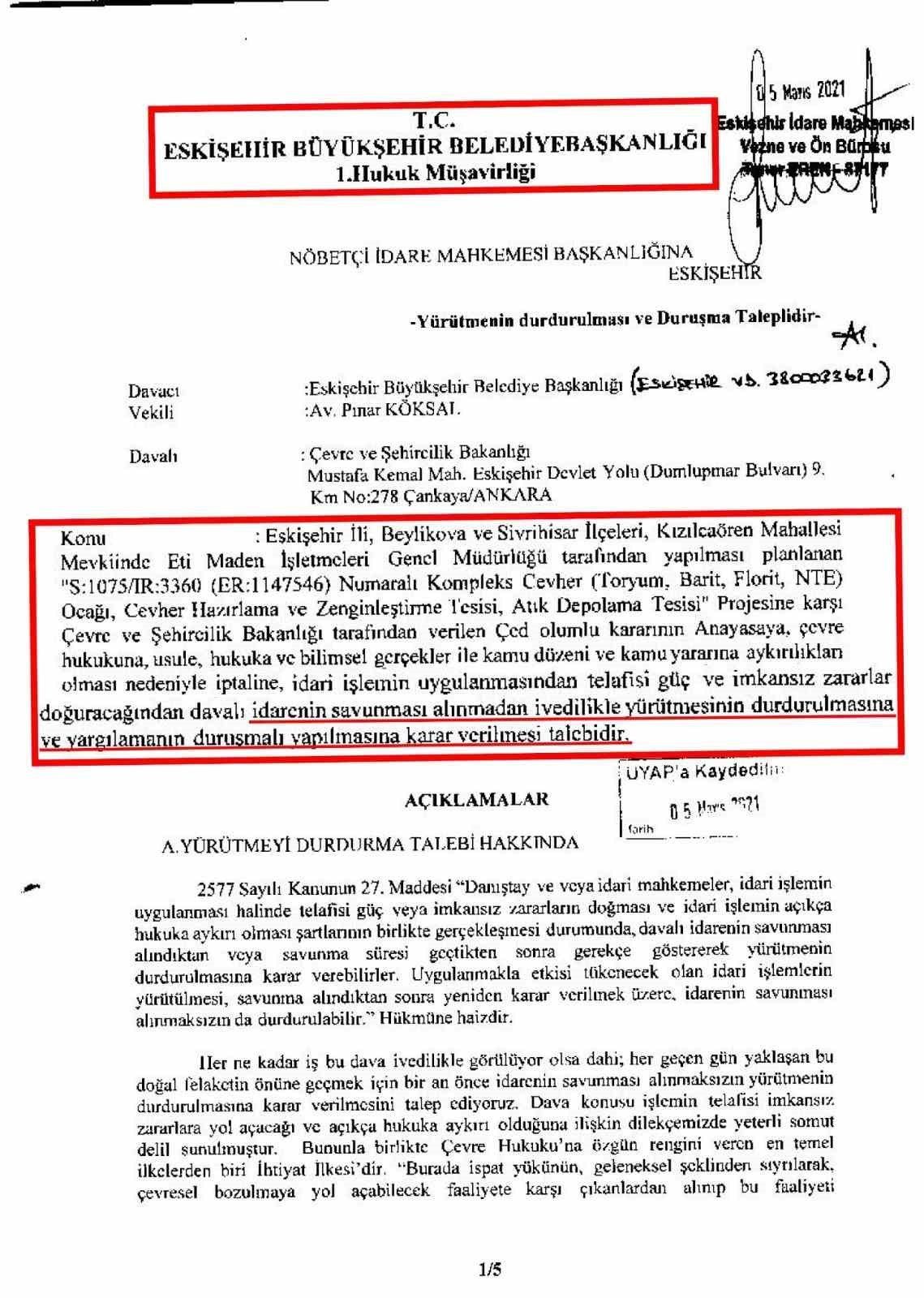 Enerji ve Tabii Kaynaklar Bakanı Alparslan Bayraktar, Beylikova’daki Nadir Toprak Elementi Tesisi’yle ilgili Eskişehir Büyükşehir Belediyesi’nin yürütmeyi durdurma davası açtığına dair belgeler paylaştı. Bakan Bayraktar’ın yaptığı sosyal medya paylaşımının ardından, AK Parti İl Başkanı Gürhan Albayrak konuyla ilgili açıklamada bulundu. Yayımlanan belgelere işaret eden Başkan Albayrak, Cumhuriyet Halk Partisi’ni (CHP) sert bir dille eleştirdi.