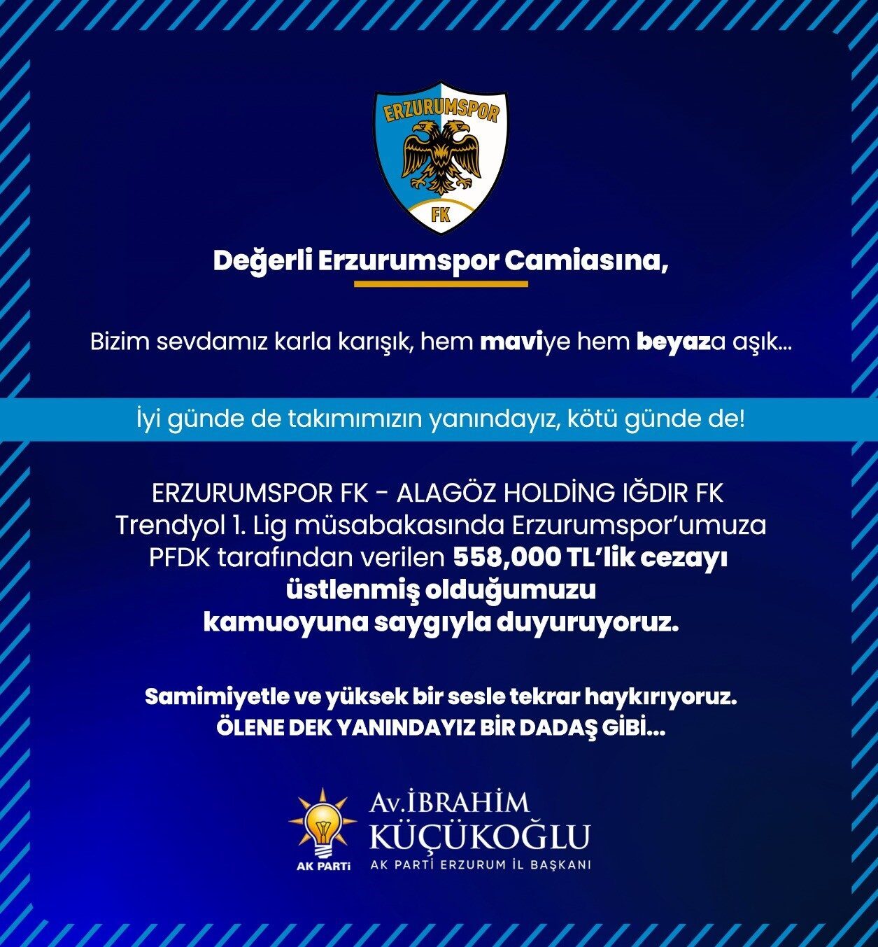 Hafta sonunda Erzurum’da oynanan Iğdır FK karşılaşması sonrası PFDK tarafından Erzurumspor’a verilen 558 bin TL’lik cezayı üstleneceklerini açıklayan Başkan Küçükoğlu sosyal medya hesabından yaptığı paylaşımda , “Değerli Erzurumspor camiasına, Bizim sevdamız karla karışık, hem maviye hem beyaza aşık. İyi günde de takımımızın yanındayız, kötü günde de! Erzurumspor Fk – Alagöz Holding Iğdır Fk 1. Lig müsabakasında Erzurumspor’umuza PFDK tarafından verilen 558,000 TL’lik cezayı üstlenmiş olduğumuzu kamuoyuna saygıyla duyuruyoruz. Samimiyetle ve yüksek bir sesle tekrar haykırıyoruz. Ölene dek yanındayız bir dadaş gibi” ifadelerine yer verildi.