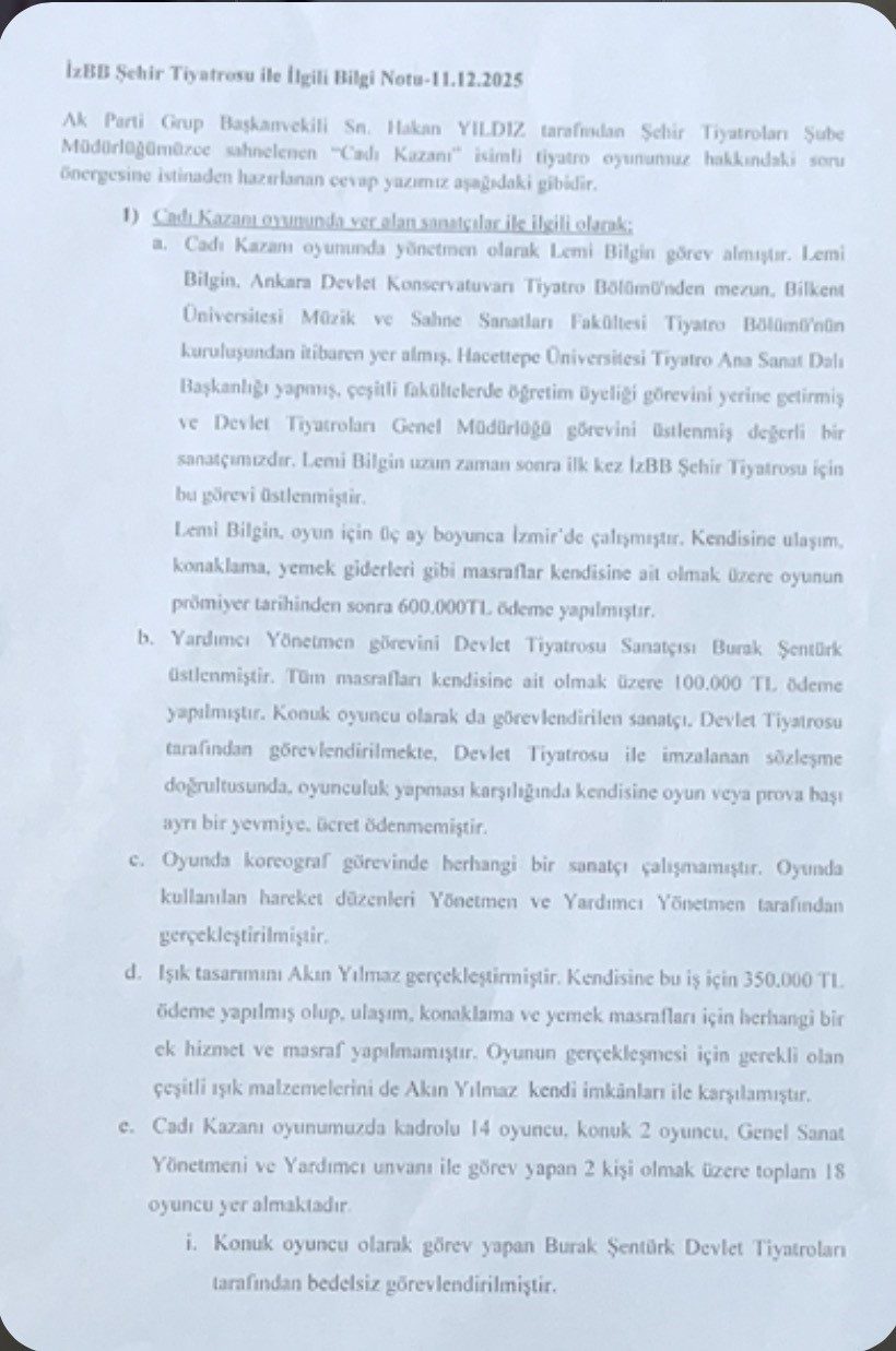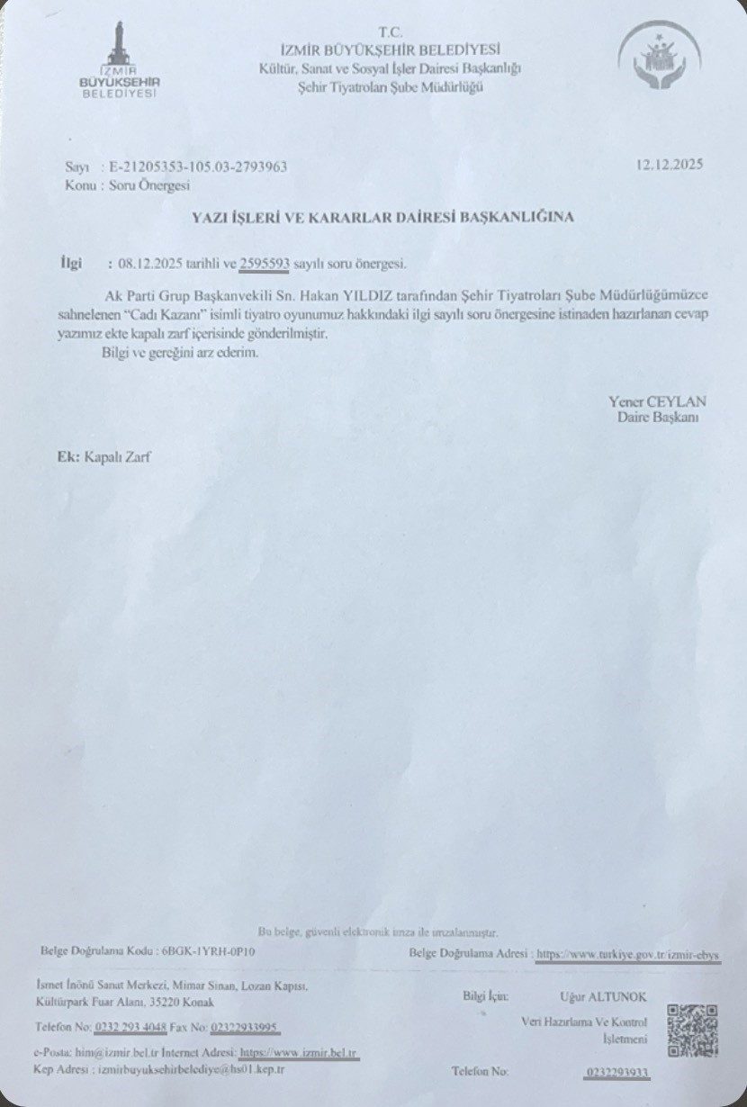 İZMİR BÜYÜKŞEHİR BELEDİYESİ ŞEHİR TİYATROLARI ŞUBE MÜDÜRLÜĞÜ TARAFINDAN AK PARTİ GRUP BAŞKANVEKİLİ HAKAN YILDIZ’IN ŞEHİR TİYATROLARI ŞUBE MÜDÜRLÜĞÜNCE SAHNELENEN “CADI KAZANI” İSİMLİ TİYATRO OYUNU HAKKINDAKİ SORU ÖNERGESİNE İSTİNADEN HAZIRLANAN CEVAP YAZISI