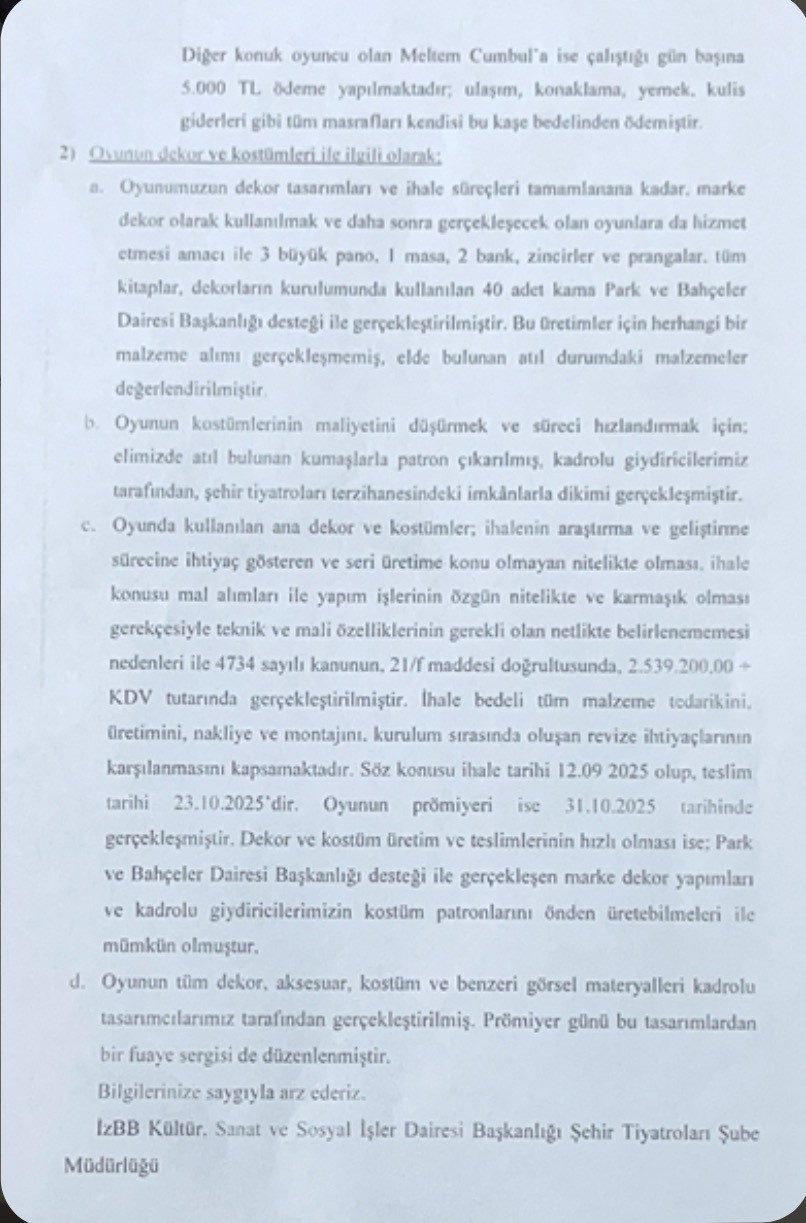Yücel Erten döneminde, eleştirilere ve eksiklerine rağmen, 12 oyuna yaklaşık 4,5 milyon lira harcandığını ifade eden Yıldız, sözlerini şu şekilde noktaladı: “Bugün yalnızca bir oyuna bu kadar para harcanmaktadır. Ayrıca Yücel Hoca döneminde 32 kadrolu sanatçı varken, Levent Bey döneminde 20 sanatçı daha alınmış ve toplam 52 kadrolu sanatçıya ulaşılmıştır. Buna rağmen, sözleşmeli ihalelerle dışarıdan yönetmen, yönetmen yardımcısı ve oyuncu getirilmesi yanlıştır. Ödenekli bir tiyatroda eserlerin, kurumun kendi 52 sanatçısı içerisinden çıkarılması gerekir. Bugün işçilerin maaşlarını alamadığı, insanların avans sistemine mahkum edildiği, emekliliğe zorlanıp kıdem ve ihbar tazminatlarının düzenli ödenmediği bir belediye yapısı varken, bu büyüklükte harcamaların yapılmasını doğru bulmuyoruz.”