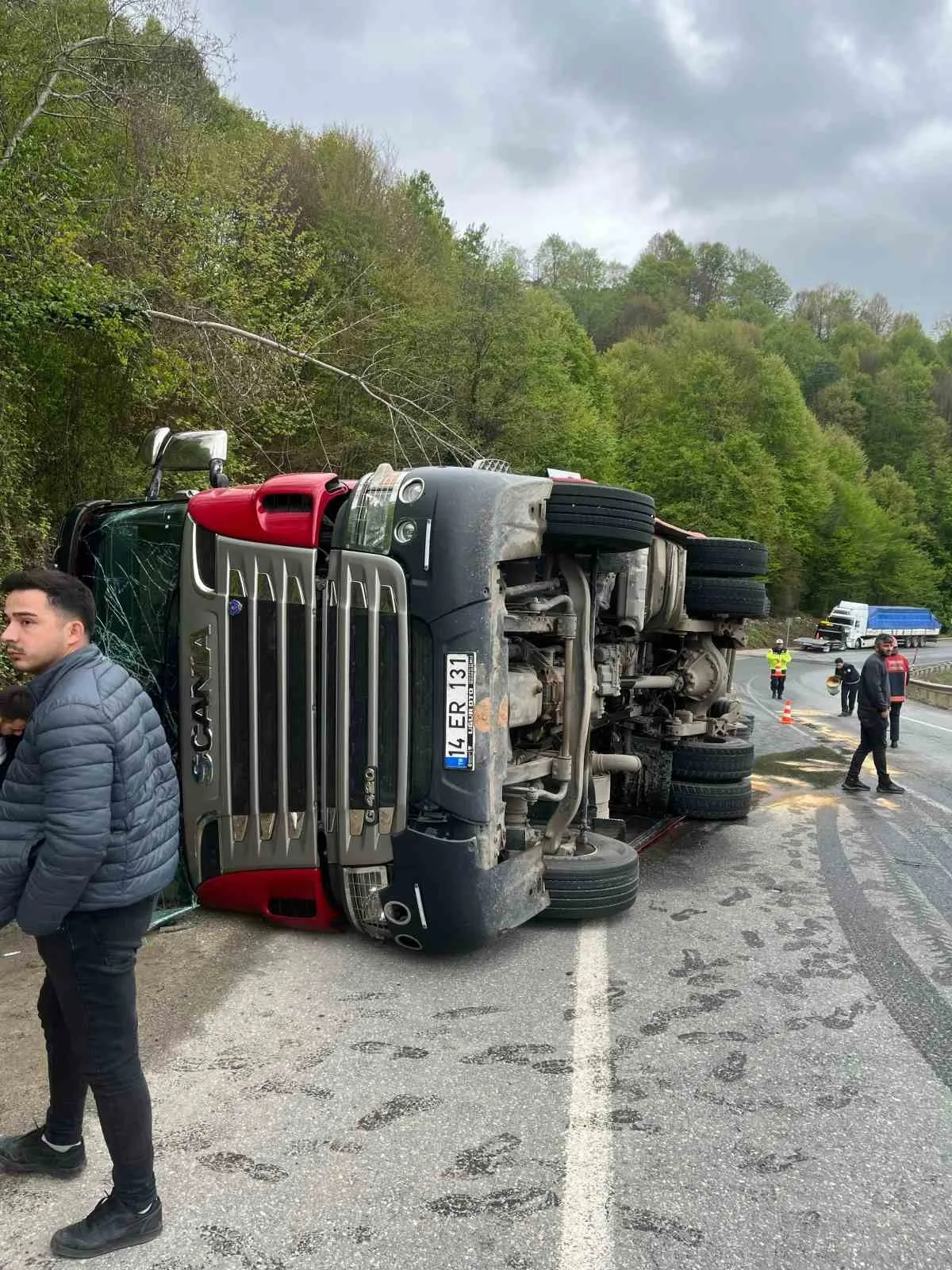 Kaza, akşam üzeri Akyazı-Mudurnu D-140 kara yolu Reşadiye mevkiinde meydana geldi. Edinilen bilgiye göre, E.K. kontrolündeki 14 ER 131 plakalı tır, viraja girdiği esnada sürücüsünün kontrolünden çıkarak devrildi. Çevredekilerin durumu 112 Acil Çağrı Merkezi’ne bildirmesi üzerine bölgeye itfaiye, sağlık ve jandarma ekipleri sevk edildi. Adrese ulaşan ekiplerce araç içerisinden çıkarılan yaralı sürücü E.K., yapılan ilk müdahalesinin ardından hastaneye kaldırıldı.