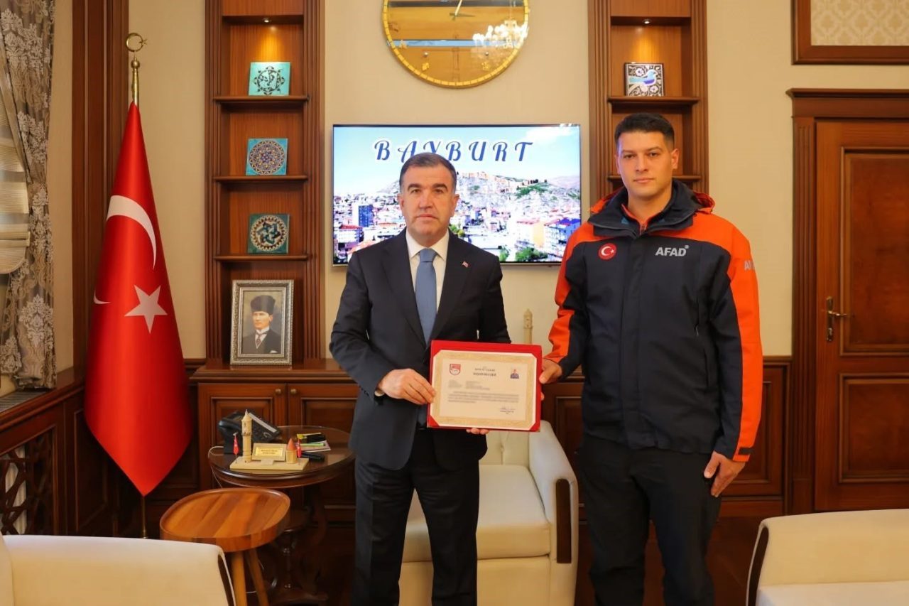 Bayburt’un Gökçedere Beldesinde seyir halindeyken kontrolden çıkarak takla atan ve ardından alev alan araçta sıkışan 5 kişiyi kurtaran İl Afet ve Acil Durum Müdürlüğü Arama Kurtarma Teknisyeni Abdurrahman Avcı’ya Vali Mustafa Eldivan tarafından başarı belgesi takdim edildi.