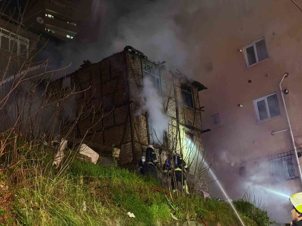 Kadıköy Mahallesi Turan Güneş Caddesi’ndeki 2 katlı ahşap metruk binada henüz bilinmeyen nedenle yangın çıktı. Gökyüzünü aydınlatan alevleri fark edenlerin 112 Acil Çağrı Merkezi’ne ihbarı üzerine adrese çok sayıda itfaiye, sağlık ve polis ekibi sevk edildi. İtfaiyenin çalışmasıyla yangın söndürülürken, ahşap bina küle döndü. Binanın bitişiğindeki 3 katlı bir başka binanın içerisine dolan duman tahliye edilirken, tedbir amaçlı olarak boşaltıldı. Öte yandan yanan ahşap binanın tuğlalarını kırarak içerisine giren itfaiye ekipleri, içeride biri olup olmadığını kontrol etti ve soğutma çalışması gerçekleştirdi.