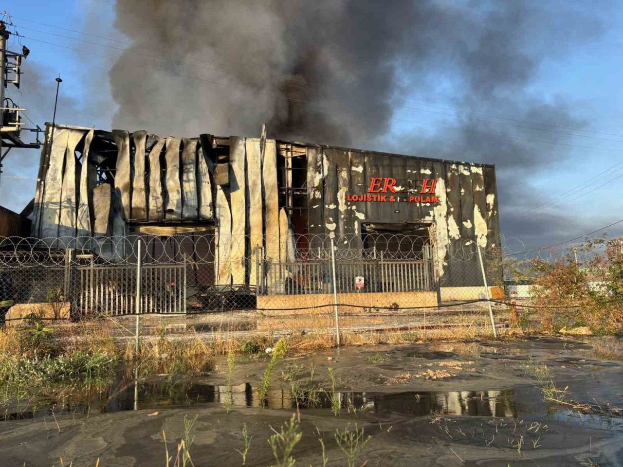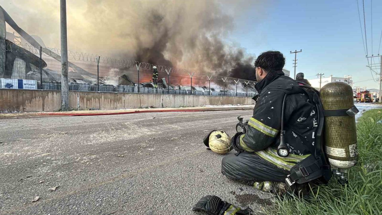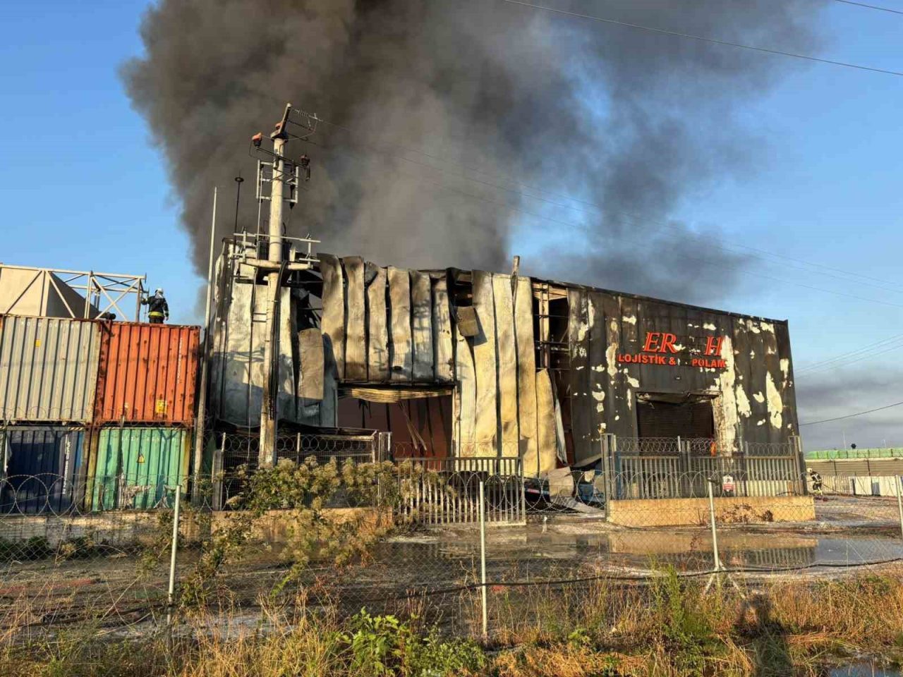 Yangın, 3 saatlik müdahalenin ardından kontrol altına alındı. Ekipler depoda soğutma çalışması gerçekleştiriyor.