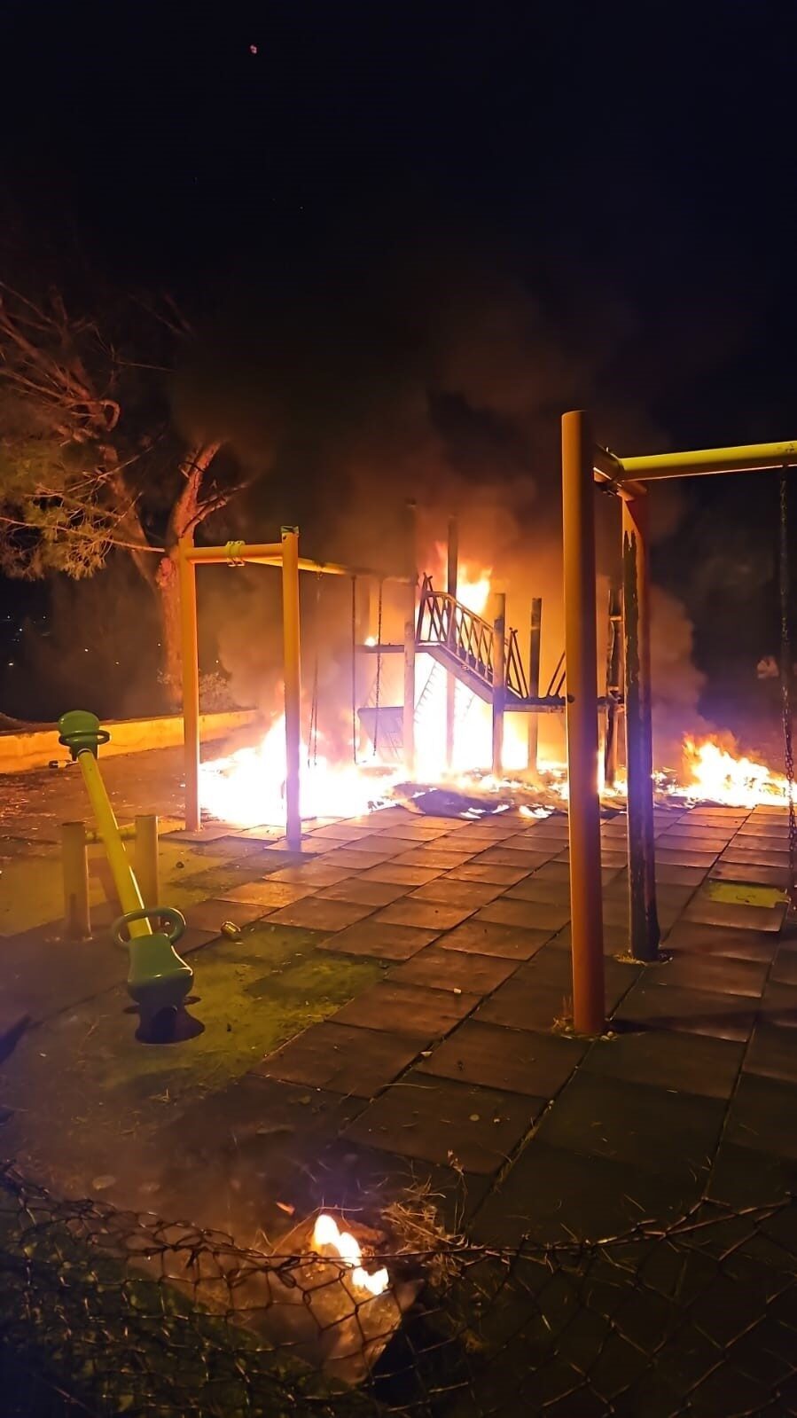 YANGIN HIZLA BÜYÜRKEN ÇOCUK PARKINDAKİ ALETLER ALEV ALEV YANMAYA BAŞLADI. HABER VERİLMESİ ÜZERİNE OLAY YERİNE İTFAİYE EKİPLERİ SEVK EDİLDİ. BİR AĞACI DA SARAN ALEVLER, YAKINDAKİ ESKİ OKUL BİNASINA SIÇRAMADAN SÖNDÜRÜLDÜ.