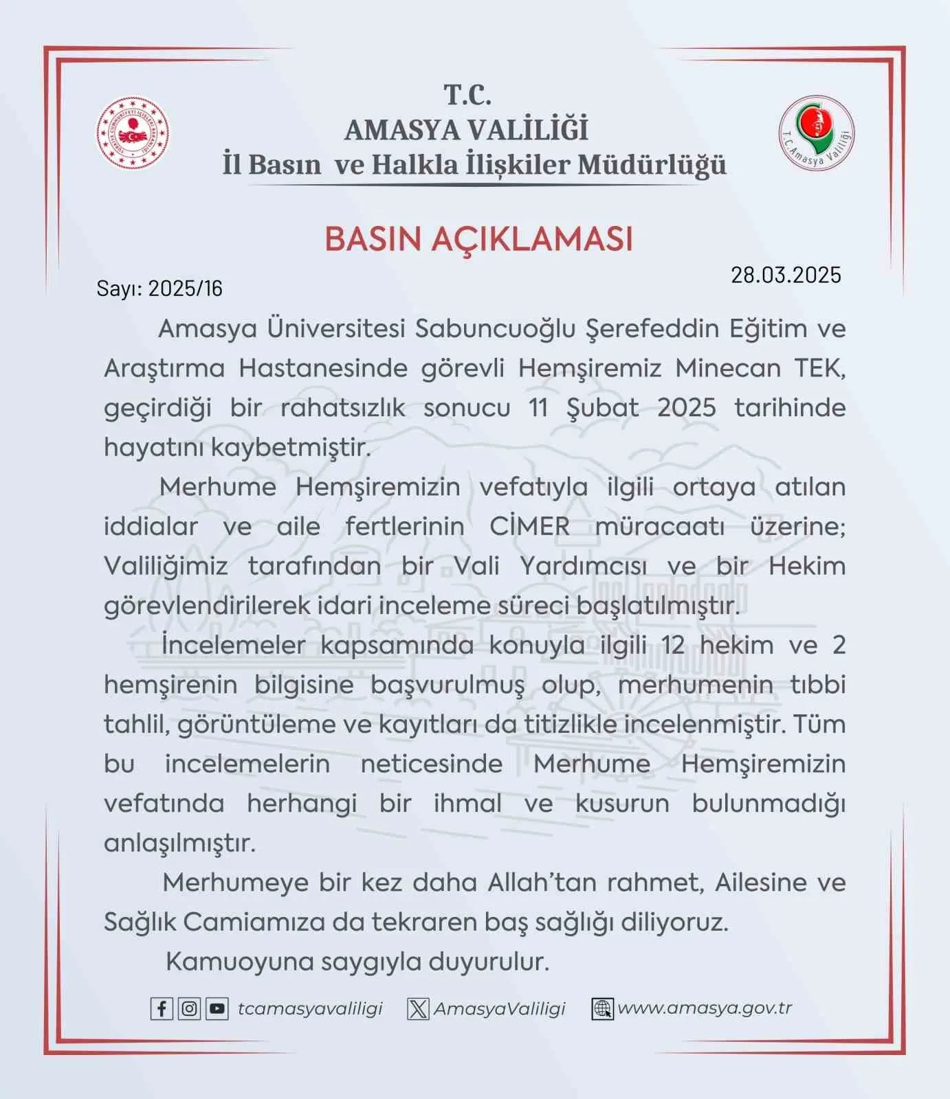 İNCELEMENİN SONUÇLARINA İLİŞKİN AMASYA VALİLİĞİ’NDEN YAPILAN AÇIKLAMADA, “AMASYA ÜNİVERSİTESİ SABUNCUOĞLU ŞEREFEDDİN EĞİTİM VE ARAŞTIRMA HASTANESİNDE GÖREVLİ HEMŞİREMİZ MİNECAN TEK, GEÇİRDİĞİ BİR RAHATSIZLIK SONUCU 11 ŞUBAT 2025 TARİHİNDE HAYATINI KAYBETMİŞTİR. MERHUME HEMŞİREMİZİN VEFATIYLA İLGİLİ ORTAYA ATILAN İDDİALAR VE AİLE FERTLERİNİN CİMER MÜRACAATI ÜZERİNE VALİLİĞİMİZ TARAFINDAN BİR VALİ YARDIMCISI VE BİR HEKİM GÖREVLENDİRİLEREK İDARİ İNCELEME SÜRECİ BAŞLATILMIŞTIR. İNCELEMELER KAPSAMINDA KONUYLA İLGİLİ 12 HEKİM VE 2 HEMŞİRENİN BİLGİSİNE BAŞVURULMUŞ OLUP, MERHUMENİN TIBBİ TAHLİL, GÖRÜNTÜLEME VE KAYITLARI DA TİTİZLİKLE İNCELENMİŞTİR. TÜM BU İNCELEMELERİN NETİCESİNDE MERHUME HEMŞİREMİZİN VEFATINDA HERHANGİ BİR İHMAL VE KUSURUN BULUNMADIĞI ANLAŞILMIŞTIR. MERHUMEYE BİR KEZ DAHA ALLAH’TAN RAHMET, AİLESİNE VE SAĞLIK CAMİAMIZA DA TEKRAREN BAŞ SAĞLIĞI DİLİYORUZ” İFADELERİNE YER VERİLDİ.