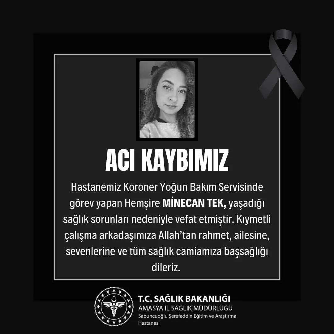 AMASYA ÜNİVERSİTESİ SABUNCUOĞLU ŞEREFEDDİN EĞİTİM VE ARAŞTIRMA HASTANESİ’NDE 4 YILDIR GÖREV YAPAN MİNECAN TEK, 6 ŞUBAT GÜNÜ GRİBAL ENFEKSİYON ŞÜPHESİYLE ÇALIŞTIĞI HASTANEYE MÜRACAAT ETTİ. ARDINDAN ÖZEL AMASYA KOLMED HASTANESİ’NE BAŞVURDU. BAŞLANACAK SERUM TEDAVİSİ ÖNCESİNDE DURUMUNDA ANORMALLİK GÖRÜLEN 32 YAŞINDAKİ TEK, AĞIRLAŞMASI ÜZERİNE KALDIRILDIĞI AMASYA ÜNİVERSİTESİ SABUNCUOĞLU ŞEREFEDDİN EĞİTİM VE ARAŞTIRMA HASTANESİ YOĞUN BAKIM ÜNİTESİNDE VERDİĞİ YAŞAM MÜCADELESİNİ 11 ŞUBAT GÜNÜ KAYBETTİ. HASTANE BAHÇESİNDE YAPILAN TÖRENİN ARDINDAN MEMLEKETİ IĞDIR’DA SON YOLCULUĞUNA UĞURLANAN MİNECAN TEK’İN VEFATI SONRASI YAPTIĞI AÇIKLAMADA GRİBAL ENFEKSİYONA SEBEP OLAN VİRÜSÜN KALP ZARIYLA BULUŞMASI SONUCU KALBİN POMPALAMA GÖREVİNİ GERÇEKLEŞTİREMEDİĞİ BİLGİSİNİ PAYLAŞAN AMASYA VALİSİ ÖNDER BAKAN, İNCELEME YAPILMASI TALİMATI VERMİŞTİ.