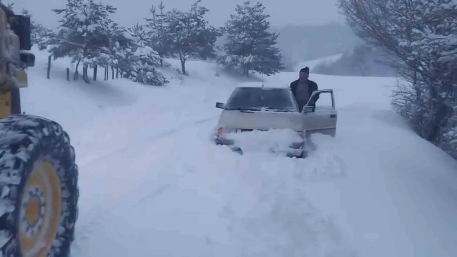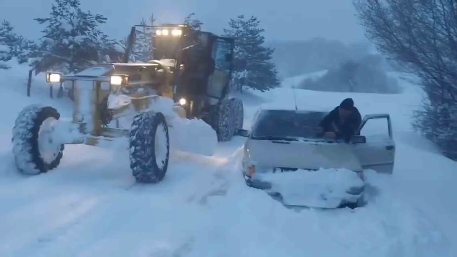 Amasya’da karla kaplı köy yolunda araçlarıyla mahsur kalan aileyi, yakıtları bitmek üzereyken Amasya İl Özel İdaresi greyder operatörleri kurtardı.