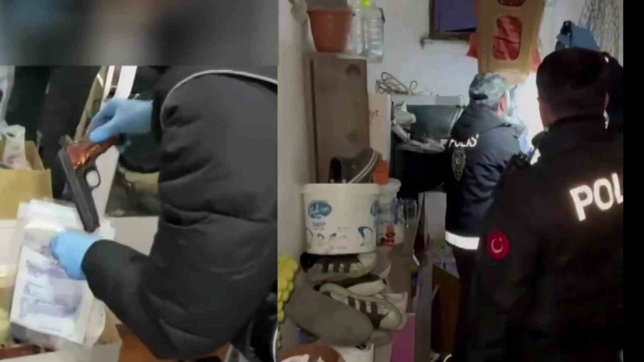 BELİRLENEN ADRESLERDE YAPILAN ARAMALARDA 750 ADET SENTETİK ECZA, 105 GRAM BONZAİ HAMMADDESİ EMDİRİLMİŞ TÜTÜN, 87,80 GRAM ESRAR, 1,26 GRAM METAMFETAMİN, 3 ADET PUYP VE 1 ADET KURUSIKI TABANCA ELE GEÇİRİLDİ.