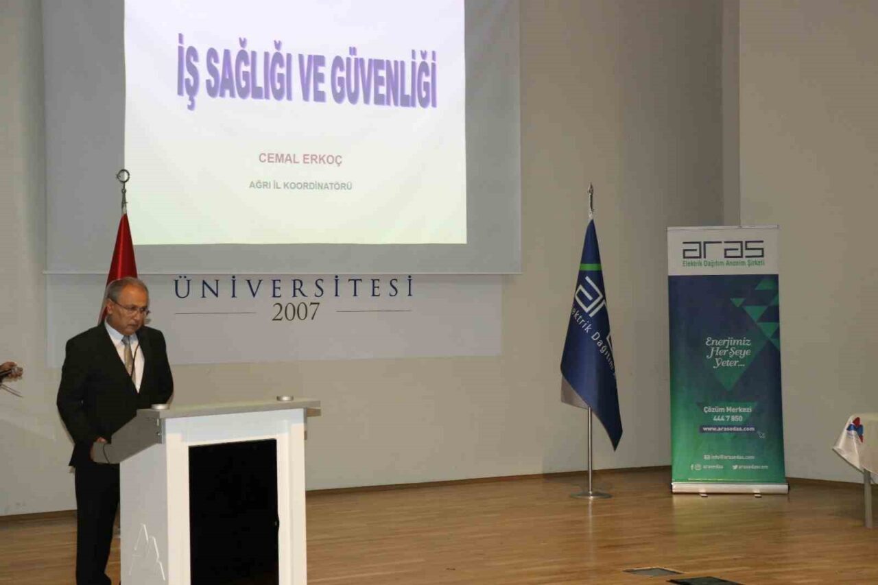 Çalıştayda, Aras EDAŞ İSG uygulamaları hakkında bilgilendirmelerde bulunan Ağrı İl Koordinatörü Cemal Erkoç, İSG mevzuatı, Türkiye’deki iş kazalarına ilişkin istatistikler, yüksek gerilim sahalarında uygulanan güvenlik prosedürleri, yangın türleri ve güvenli çalışma yöntemleri konularında katılımcılara detaylı bilgiler sundu. Etkinliğin düzenlenmesine katkı sunan Ağrı İbrahim Çeçen Üniversitesi İş Sağlığı ve Güvenliği Koordinatörü Doç. Dr. Pınar Baykan’a teşekkür etti.