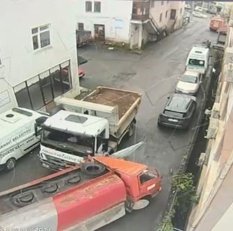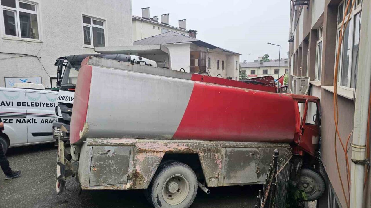Artvin’in Arhavi ilçesinde freni boşalan mazot yüklü bir tanker, kontrolden çıkarak belediyeye ait araca ve Kaymakamlık binasına çarparak durabildi. Kazada can kaybı yaşanmazken, kaza anı güvenlik kameralarına yansıdı.