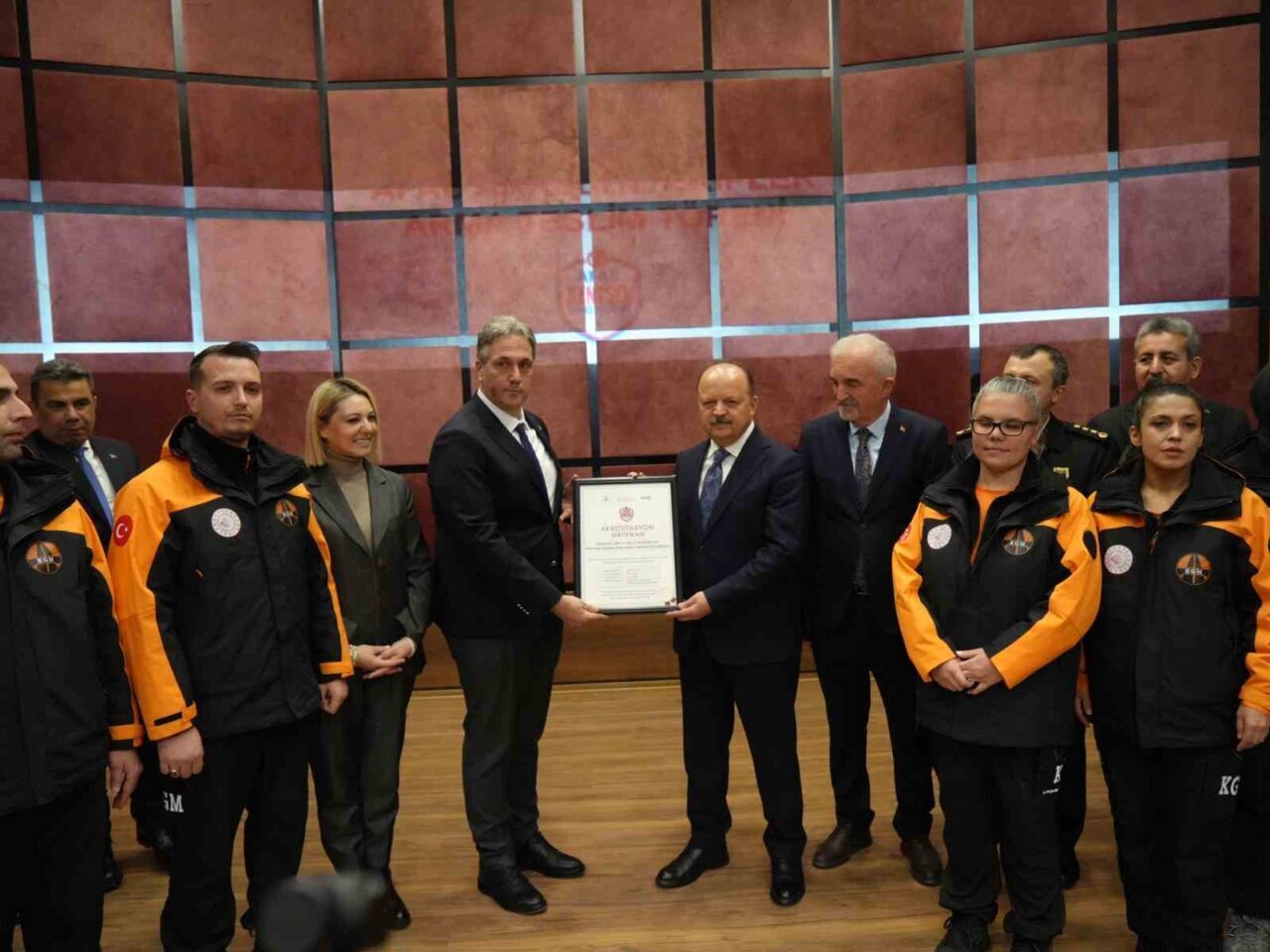 KONUŞMALARIN ARDINDAN AFAD İLE KENTSEL ARAMA VE KURTARMA ALANINDA AKREDİTE OLAN KÜRE ETİ BAKIR, KARAYOLLARI 15. BÖLGE MÜDÜRLÜĞÜ VE İL MİLLİ EĞİTİM MÜDÜRLÜĞÜ EKİPLERİNE SERTİFİKALARI VE ARMALARI VALİ MEFTUN DALLI VE KASTAMONU MİLLETVEKİLİ SERAP EKMEKCİ TARAFINDAN TAKDİM EDİLDİ.