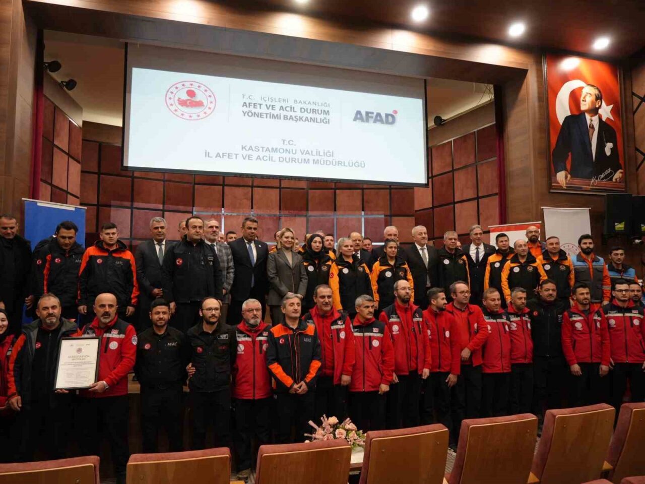 Konuşmaların ardından AFAD ile kentsel arama ve kurtarma alanında akredite olan maden şirketi, Karayolları 15. Bölge Müdürlüğü ve İl Milli Eğitim Müdürlüğü ekiplerine sertifikaları ve armaları Vali Meftun Dallı ve Kastamonu Milletvekili Serap Ekmekci tarafından takdim edildi.