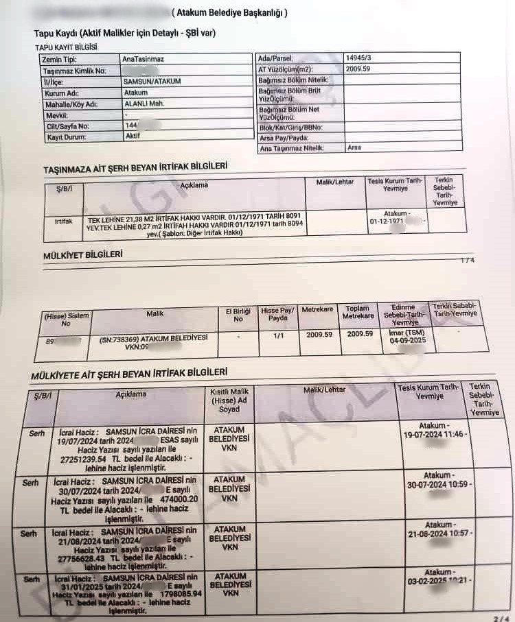 Toplantıda ayrıca, Alanlı Mahallesi 14 bin 945 ada 3 parselde bulunan 2009 metrekarelik arsa vasfındaki taşınmazın satış yetkisinin belediyeye verilmesi teklifi görüşüldü. AK Partili meclis üyeleri, üzerinde 10 adet icra haczi bulunan arsanın satış gerekçesini sorarken, belediye bürokratları hacizlerin kaldırılmasının ardından satışın yapılabilmesi için meclis yetkisinin gerekli olduğunu belirtti.