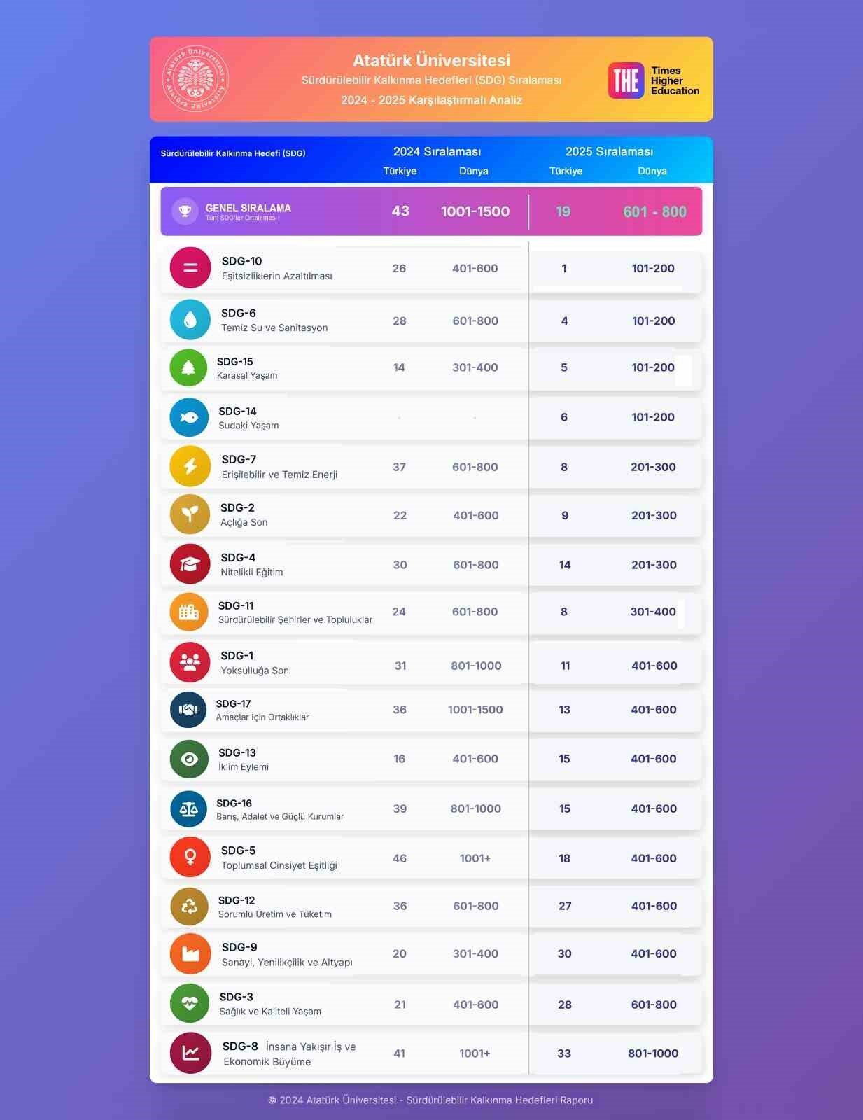 Atatürk Üniversitesi, Birleşmiş Milletler’in Sürdürülebilir Kalkınma Hedefleri (Sustainable Development Goals-SDG) kapsamında Times Higher Education (THE) tarafından hazırlanan 2025 Etki Sıralamasında büyük bir başarıya imza attı. 2024 yılında dünya sıralamasında 1001-1500 bandında yer alan Atatürk Üniversitesi, 2025 verilerine göre 601-800 bandına yükselerek küresel çapta dikkat çekici bir ilerleme sağladı. Türkiye sıralamasında da büyük bir sıçrama gerçekleştiren üniversite, geçen yıl 43. sıradayken bu yıl 19. sıraya yükseldi.