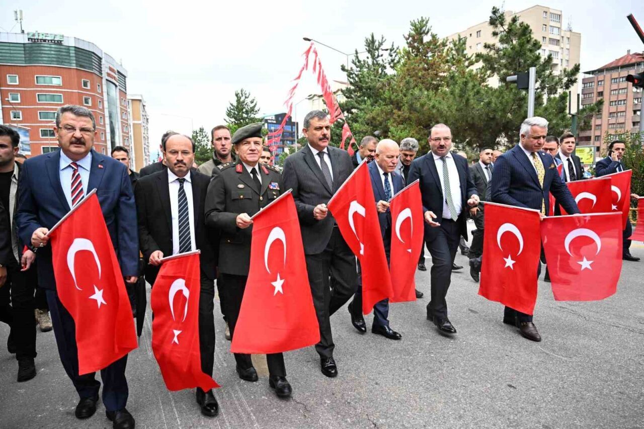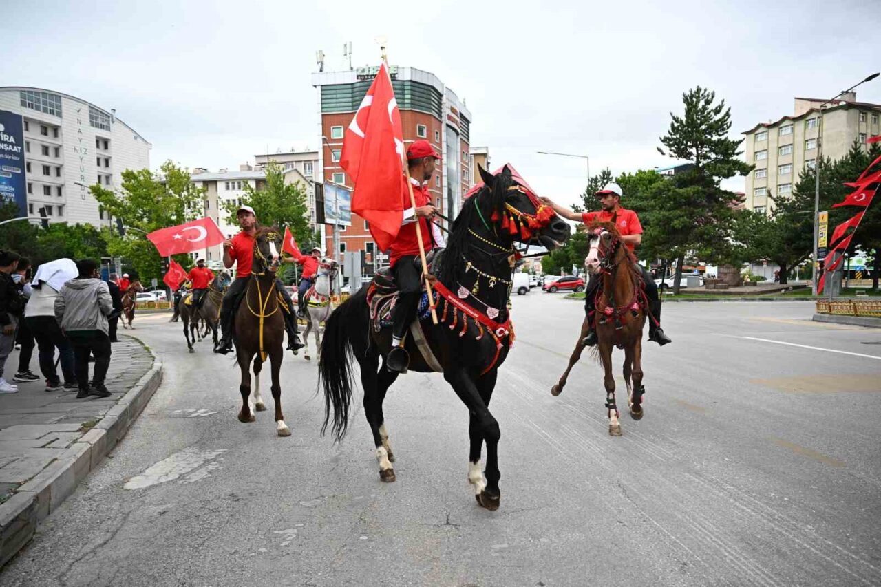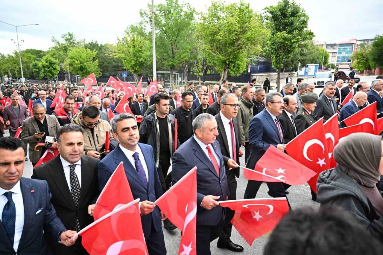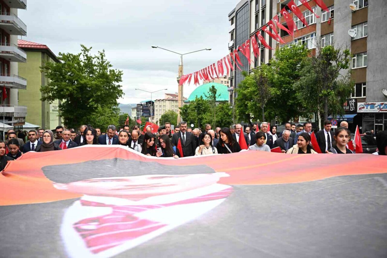 İstanbulkapı mevkiinde bir araya gelen öğrenciler, gaziler, vatandaşlar ve atlı cirit ekibi, Kolordu Komutanlığı Bölge Bandosu eşliğinde ellerinde Türk bayrakları ve Atatürk posterleriyle Havuzbaşı Kent Meydanı’na kadar yürüdü.
