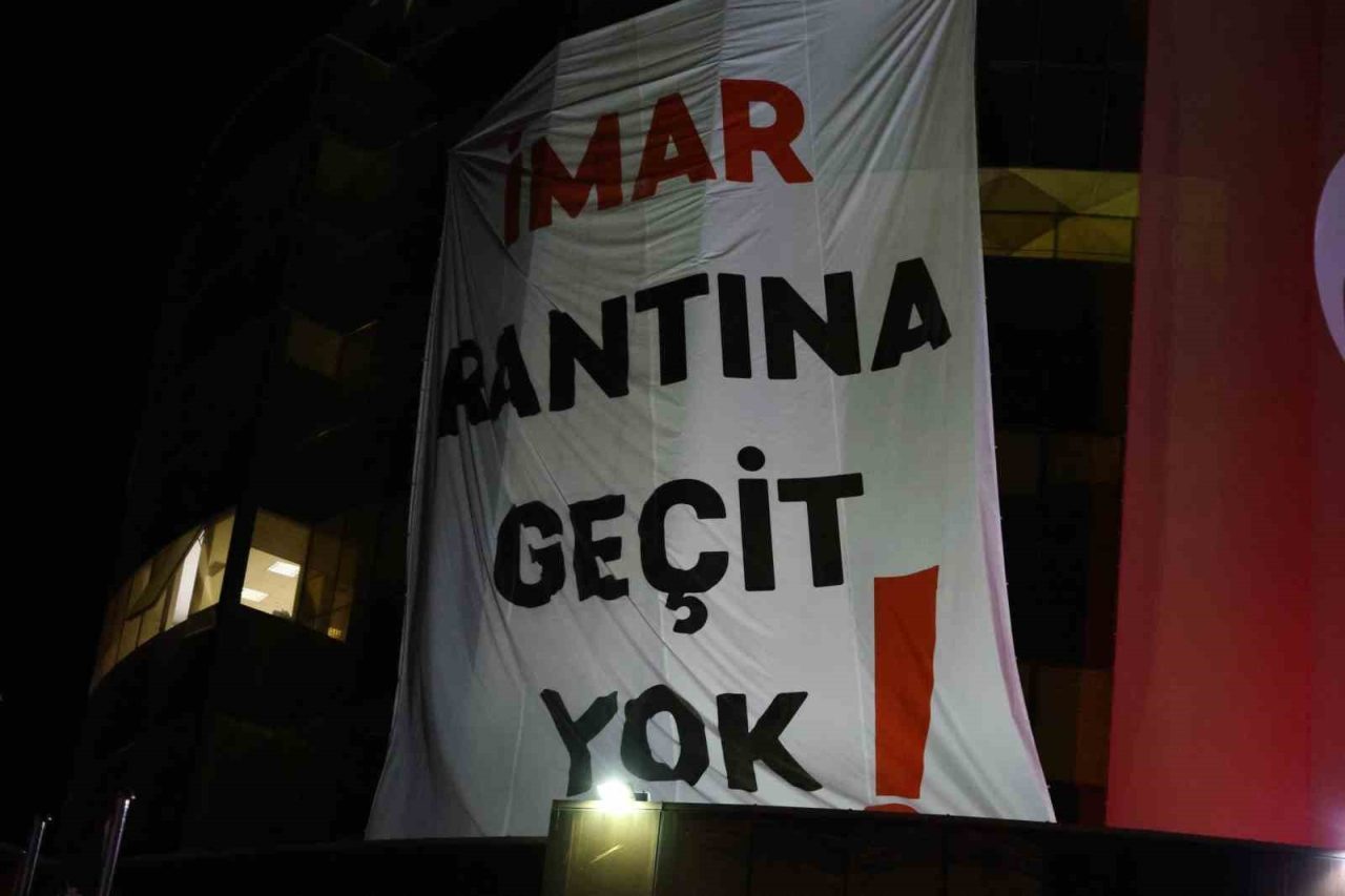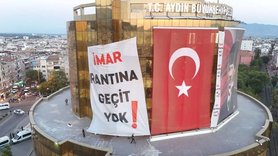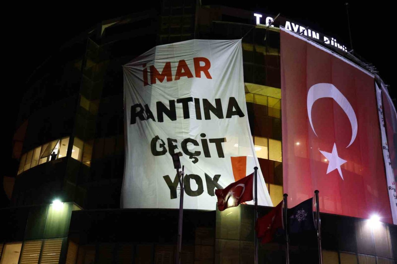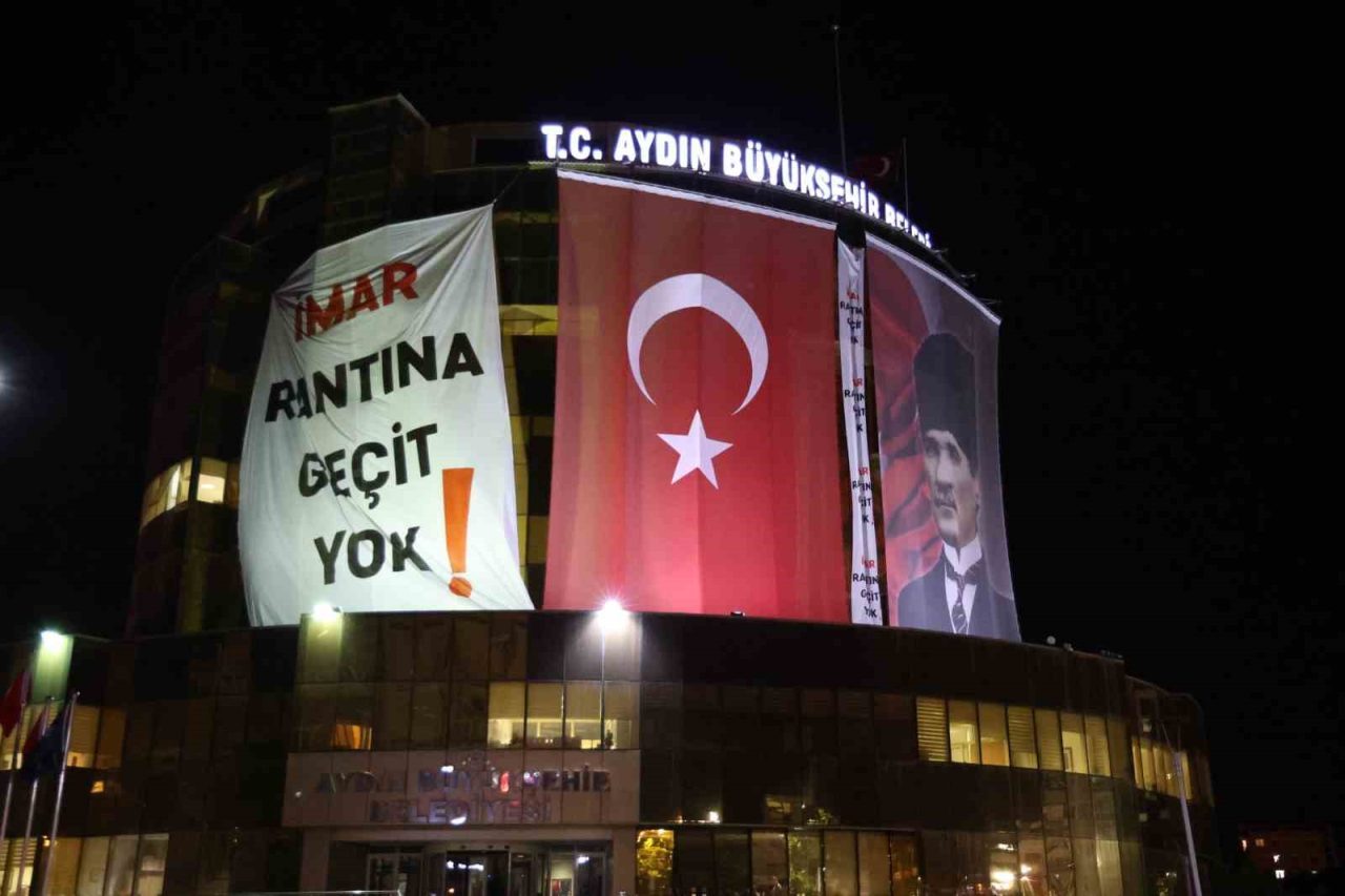 Cumhuriyet Halk Partisi (CHP) Genel Başkanı Özgür Özel’in partisinden istifa ederek AK Parti’ye geçen Özlem Çerçioğlu’na tepki göstermek amacıyla Aydın’da düzenlediği miting öncesi Aydın Büyükşehir Belediyesi binasına “İmar rantına geçit yok” yazılı dev bir pankart asıldı.