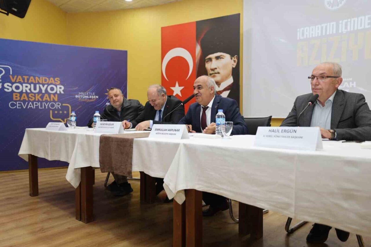 Aziziye Belediye Başkanı Emrullah Akpunar, ilçede bir yıl içerisinde yapılan çalışmaları, hayata geçirilen projeleri ve planlanan yeni yatırımları ilçe sakinlerine görsel sunumlar eşliğinde anlattı. Başkan Akpunar, Ilıca Mahallesi’ndeki kentsel dönüşüm planlamaları başta olmak üzere, üstyapı yatırım planlamalarına dönük olarak bilgiler de aktardığı halk buluşmasında; termal turizm yatırımlarından, asfalt plentine, sosyal tesis yatırımlarından çevre düzenleme ve rekreasyon planlamalarına varıncaya kadar birçok konuya değindi.
