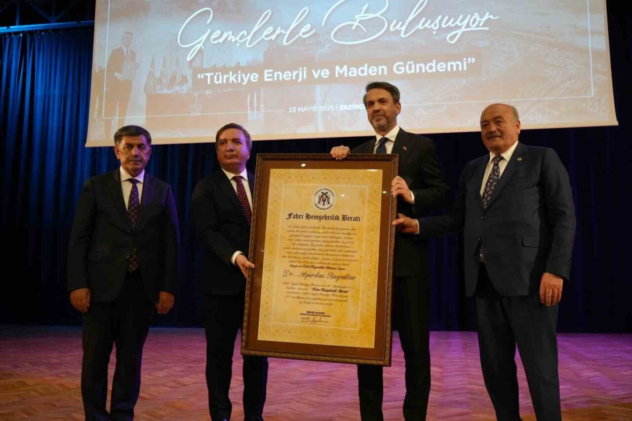 Enerji ve Tabii Kaynaklar Bakanı Alparslan Bayraktar, Erzincan Binali Yıldırım Üniversitesi Prof. Dr. Erdoğan Büyükkasap Kongre ve Kültür Merkezi’nde üniversite öğrencileri ile bir araya geldi. Bakan Bayraktar’a programda Erzincan Valisi Hamza Aydoğdu tarafından “Fahri Hemşerilik Beratı” takdim edildi.