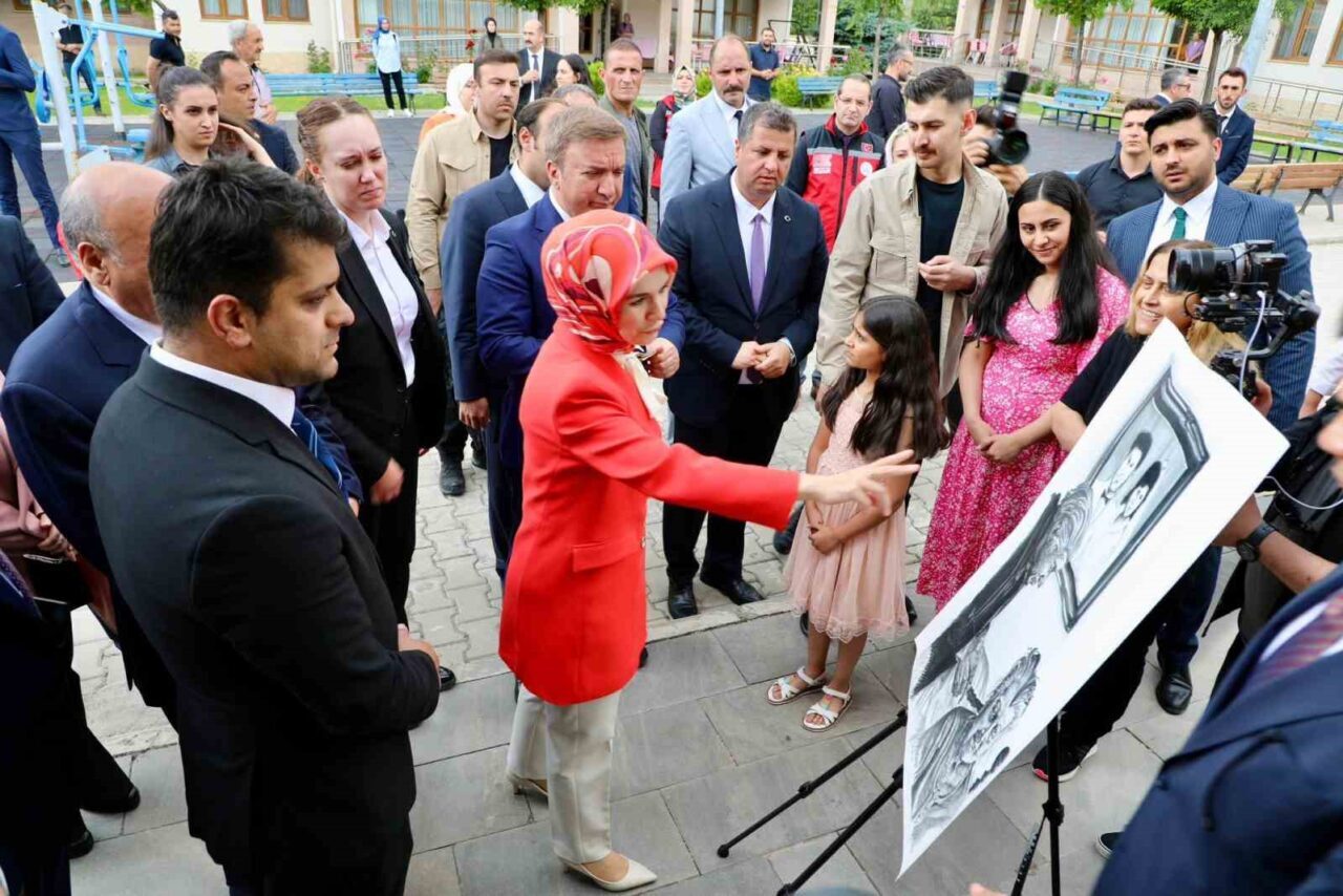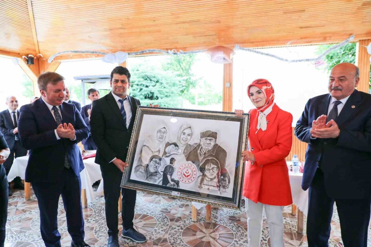 Engelsiz Yaşam Bakım Rehabilitasyon ve Aile Danışma Merkezi’nde kalan özel bireylerle bir süre sohbet eden, onların hal ve hatırlarını soran Aile ve Sosyal Hizmetler Bakanı Mahinur Özdemir Göktaş’a, kurumdaki engelli personel tarafından yapılan ve Bakan Mahinur Özdemir Göktaş’ın dedesiyle birlikte yer aldığı karakalem resim çalışması hediye edildi.