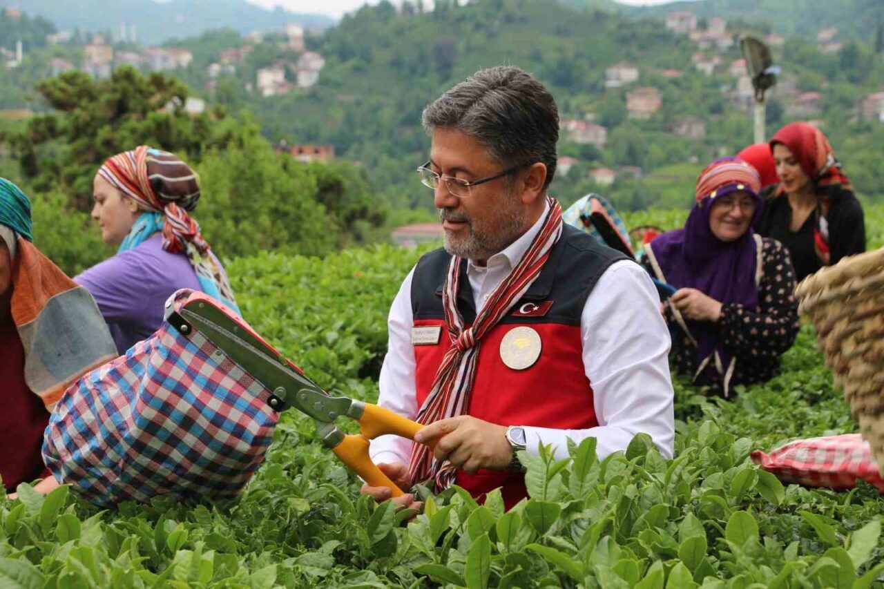 Çay hasadının ardından konuşan Bakan İbrahim Yumaklı, üretimin her aşamasında üreticilerin yanında olduklarına vurgu yaparak “Her bir ürün için tek tek çalışıyoruz. Yine dünyaya açılan kapılarımızdan bir tanesi çay ürünü. Dolayısıyla çay ile ilgili de bütün süreçlerinde hep birlikte, Rize’nin hem sivil toplum kuruluşlarından hem siyasetinden hem diğer unsurlarından bir araya gelerek bir sinerji oluşturarak süreci yönetiyoruz. Kuru çay üretiminde Türkiye olarak dünyada beşinci sıradayız, Avrupa’da birinci sıradayız. Ancak çay tüketiminde dünyada dördüncü sıradayız orada da üst sıraları zorlamaya devam ediyoruz. 2024 yılı itibarıyla çayın Türkiye ekonomisine olan katkısı yaklaşık kırk beş milyar lira, bu çok önemli bir rakam. Özellikle sadece bu yıl için bu ürünün ekonomide ağırlığını da dikkate alırsak hakikaten son derece önemli. 5 ilimiz ağırlıklı olarak üretiyor bunu Rize’de yüzde 64’ü yani 872 bin tonu, Trabzon’da yüzde 23’ü yani 306 bin tonu, Artvin’de yüzde 11’i 147 bin tonu, Giresun’da yüzde 2 yaklaşık 32 bin tonu, çok az da diğer illerimizde var. ÇAYKUR ve özel sektör sezonun açılışı itibariyle artık çay almaya başladı. Bütün hazırlıklarını tamamlamışlardı. Üretilen yaş çayı işleyen ÇAYKUR ve özel fabrikalarla birlikte 195 üretim tesisi var. Bunlardan 49’ u ÇAYKUR’un 2024 yılında ki çay rekoltesi yaklaşık 1 milyon 430 bin ton civarındaydı. Bu yıl bir milyon üç yüz bin ton civarında bir çay rekoltesi bekliyoruz” diye konuştu.