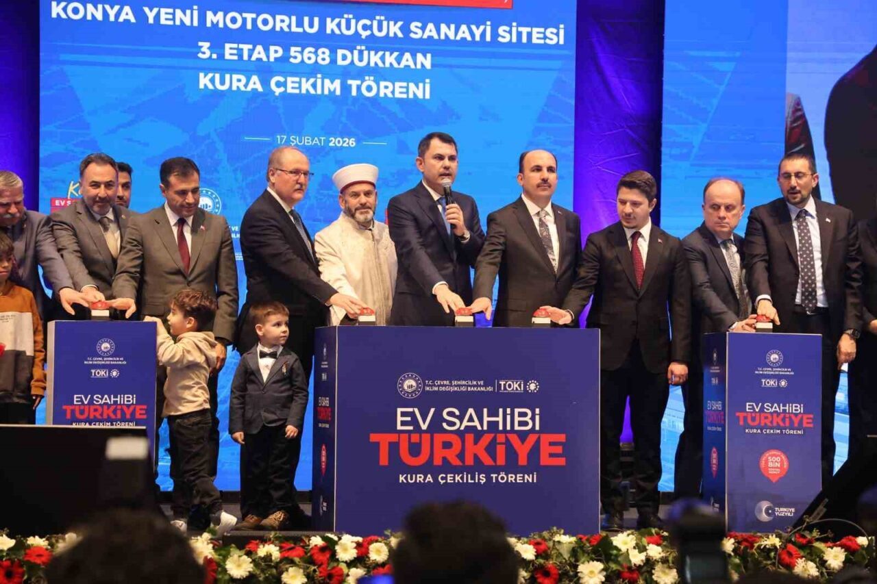 Bakan Kurum, Konya’da “Ev sahibi Türkiye” projesi kapsamında inşa edilecek 15 bin 200 konut ve Konya Motorlu Küçük Sanayi Sitesi 3. Etap 568 Dükkan Kura Çekim Töreni’ne katıldı. Tören Selçuklu Kongre Merkezi’nde İstiklal Marşı ve Cumhurbaşkanı Recep Tayyip Erdoğan’ın mesajının okunmasıyla başladı. Programda konuşan Bakan Murat Kurum, Konya’ya yeni eserler vermek için canla başla mücadele etmeye devam ettiklerini söyledi.