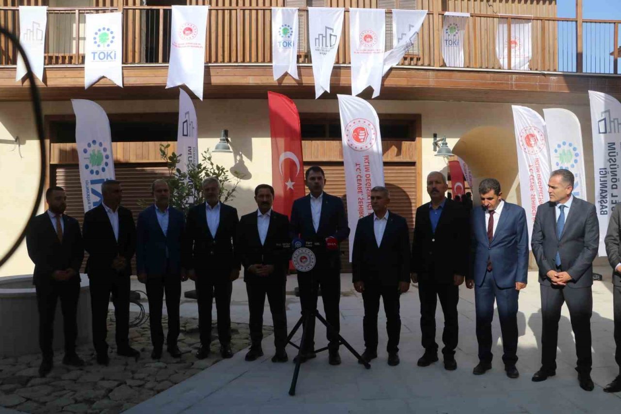 Asrın felaketinin, asrın inşa seferberliğine dönüştüğü ifade eden bakan Kurum, Kasım ayı içerisinde 350 bininci konutun anahtarını Cumhurbaşkanı Recep Tayyip Erdoğan’ın katılımıyla hak sahibi vatandaşa teslim edileceğini belirterek “Devlet-millet el ele vererek, Asrın Felaketini Asrın İnşa Seferberliğine dönüştürdük. Bugün depremden etkilen 11 ilimizde 7 gün 24 saat alın teri döken 200 bin mühendis, mimar ve işçi kardeşimizle birlikte, depremzede kardeşlerimizi bir an önce yuvalarına kavuşturmanın gayreti içindeyiz. Geçtiğimiz ay Malatya’da Sayın Cumhurbaşkanımızın teşrifleriyle 304 bininci yuvamızın anahtarlarını hak sahibi kardeşlerimize teslim ettik. Söz verdiğimiz 453 bin yuvanın, yüzde 70’ini tamamladık. Yani şu anda; her 3 depremzede kardeşimizden 2’sini yeni yuvasına kavuşturduk. Önümüzdeki ay 350 bininci konutumuzun anahtarlarını yine Cumhurbaşkanımızla birlikte teslim edeceğiz. inşallah yılsonuna geldiğimizde burada olacağız, son anahtarlarımızı da vatandaşlarımızla buluşturacağız. Biz milletimize ne söz verdiysek, fazlasıyla yerine getirmek için gece gündüz durmaksızın ilerliyor, milletimizin dualarına nail olabilmek için var gücümüzle azimle, kararlılıkla çalışıyoruz. Bugün geldiğimiz noktada Hatay’ımızda 86 bin konut ve iş yerimizi tamamladık ve hak sahibi kardeşlerimize teslim ettik. Şu anda şehrimizde 66 binin üzerinde konut, iş yeri ve köy evinin inşaatına süratle devam ediyoruz. Söz verdiğimiz gibi bu yılın sonuna kadar Hatay’ımız da 153 bin bağımsız bölümü teslim edeceğiz. Deprem bölgesinin tamamın da ise 453 bin yuvamızı tamlayarak hak sahibi kardeşlerimizi güvenli ve huzurlu yuvalarına kavuşturacağız” ifadelerini kullandı.