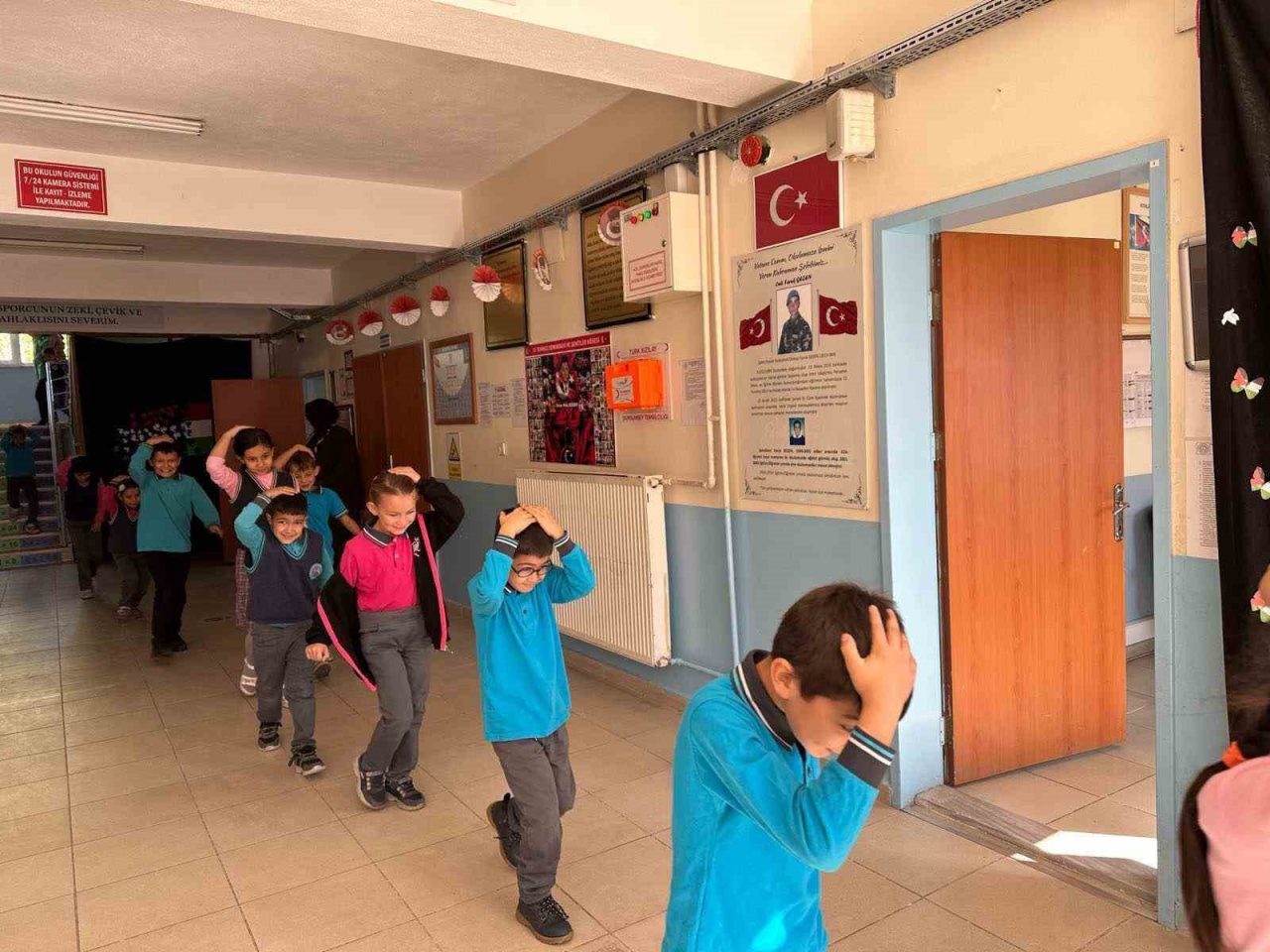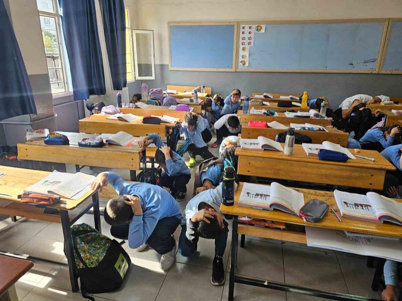 Tatbikat kapsamında öğrenciler, “Çök-Kapan-Tutun” uygulamasıyla bir deprem anında doğru davranış biçimlerini pekiştirirken, öğretmenlerin rehberliğinde güvenli şekilde okul binalarını tahliye etti.