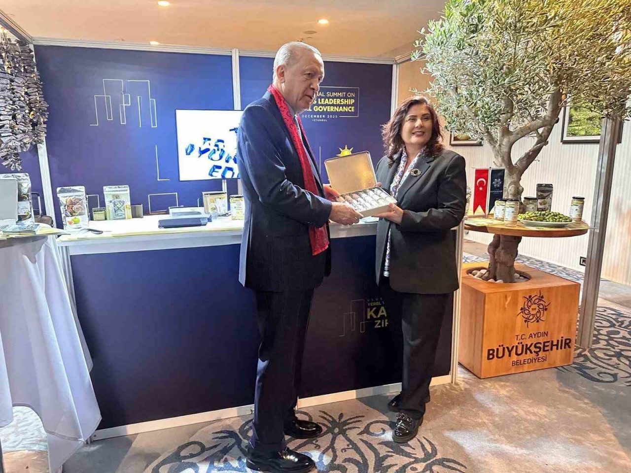 Aydın Büyükşehir Belediye Başkanı Özlem Çerçioğlu, Uluslararası Yerel Yönetimlerde Kadın Zirvesi’nde Cumhurbaşkanı Recep Tayyip Erdoğan’ı, Aydın standında ağırlayarak başta Aydın inciri olmak üzere şehrin yöresel ürünlerini tanıtıp Aydın’a özel işlemeli Başefelerin taktığı fes ile birlikte yöresel ürünler hediye etti.