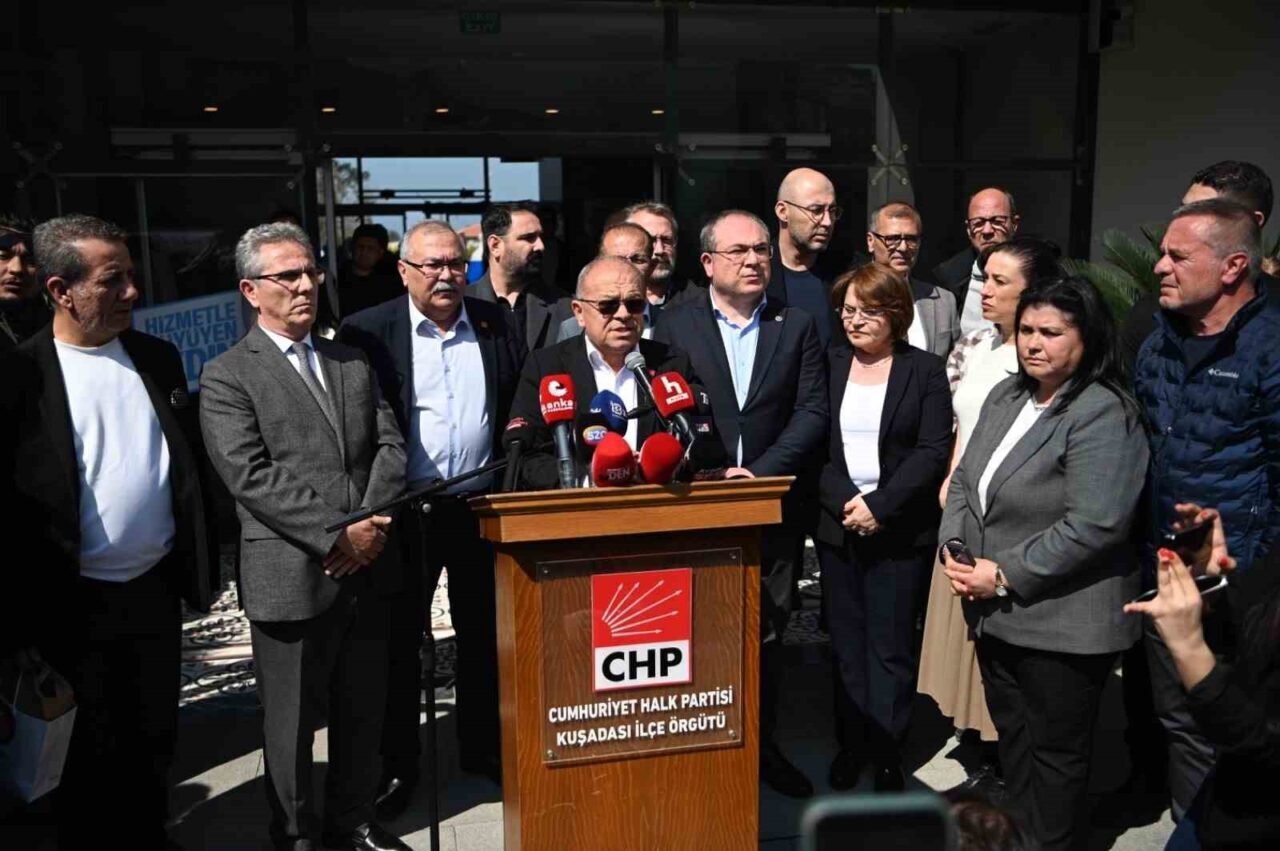 KUŞADASI BELEDİYE BAŞKANI ÖMER GÜNEL’İN İSTANBUL’DA GÖZALTINA ALINMASI TEPKİYLE KARŞILANDI. KUŞADASI BELEDİYESİ ÖNÜNDE MİLLETVEKİLLERİ, CHP’Lİ YÖNETİCİLER VE BELEDİYE BAŞKANLARININ KATILIMIYLA BASIN AÇIKLAMASI DÜZENLENDİ.