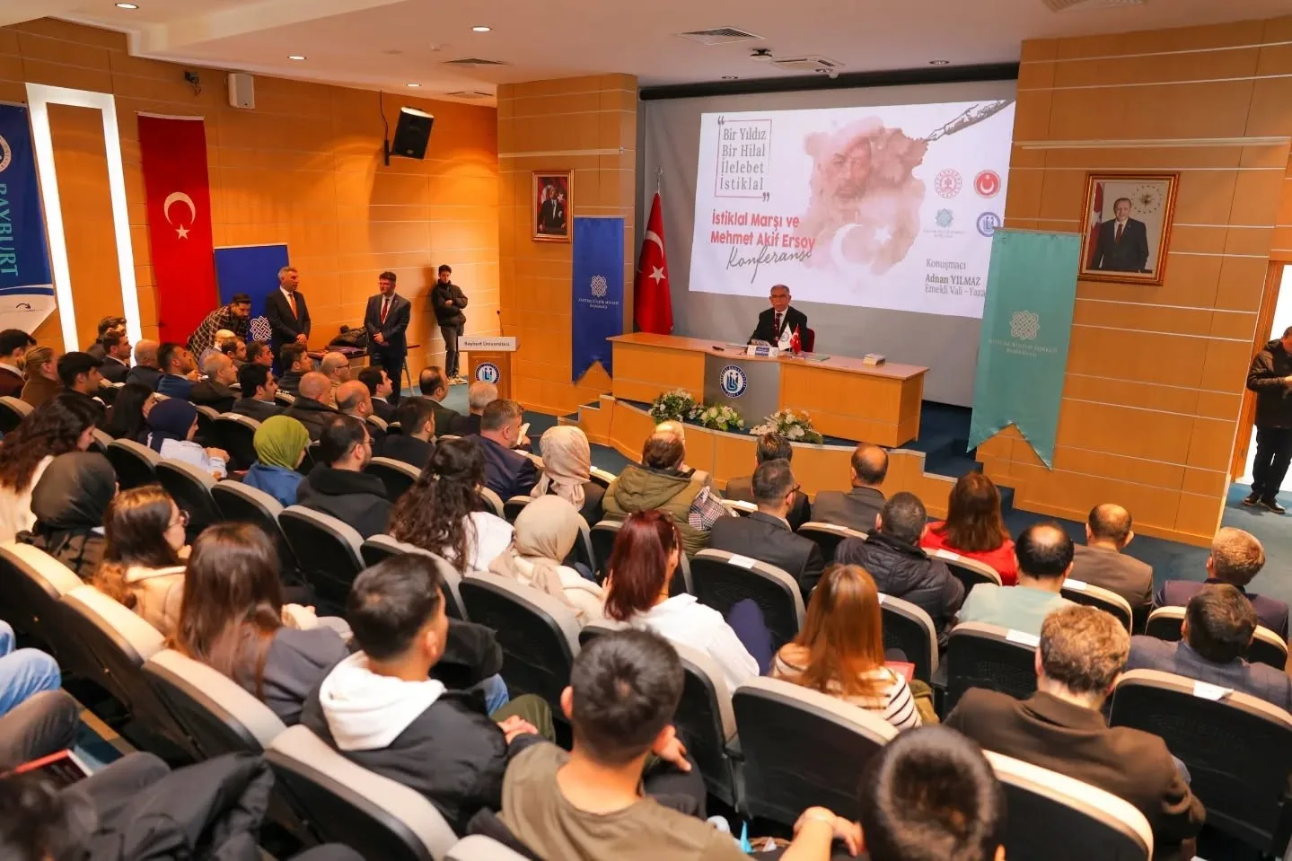 Prof. Dr. Gökhan Budak Konferans Salonu’nda, İstiklal Marşı’nın kabulünün 104. yılı anısına düzenlenen programda, emekli Vali-Yazar Adnan Yılmaz, İstiklal Şairi Mehmet Akif Ersoy’un hayatını, düşünce dünyasını ve İstiklal Marşı’nın derin anlamını katılımcılarla paylaştı.