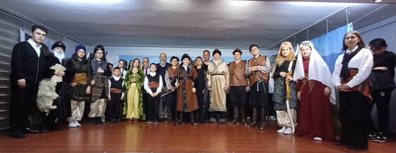 Okulun çok amaçlı salonunda sahnelenen oyun, ilgiyle izlendi. ’Dede Korkut’u bir de çocuklardan dinleyin’ temasıyla öğrenciler tarafından hazırlanan oyunda, Dede Korkut hikayelerinden kesitler sunuldu. Giydikleri kostümlerle, canlandırdıkları karakterlerle üstün performans sergileyen öğrencilerin oyunu izleyenlerden tam not aldı.