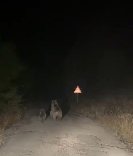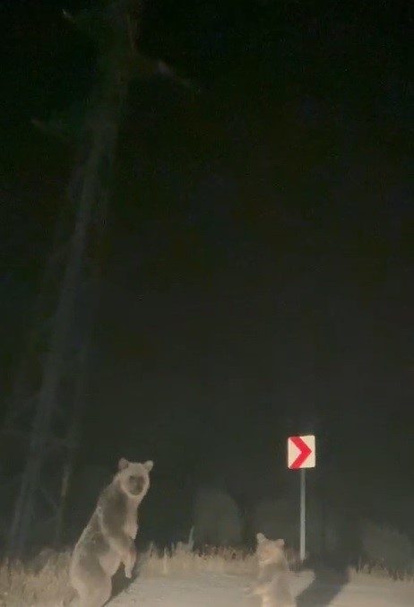 Bayburt’ta araç önüne çıkan anne ve yavru ayı, koşmaktan yorulunca durarak araçtakilere kızgın bakışlar yöneltti. Ayıların arka ayakları üzerinde dikilerek korku saldıkları o anlar, cep telefonu kamerasına yansıdı.