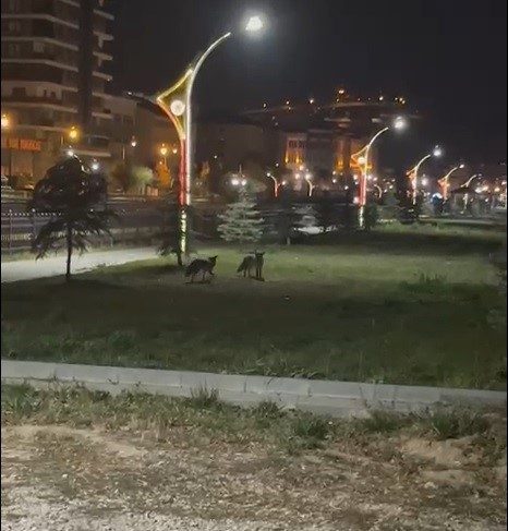 Bayburt’ta şehir merkezine inen iki tilki, gece saatlerinde birbirleriyle oynarken görüntülendi.
