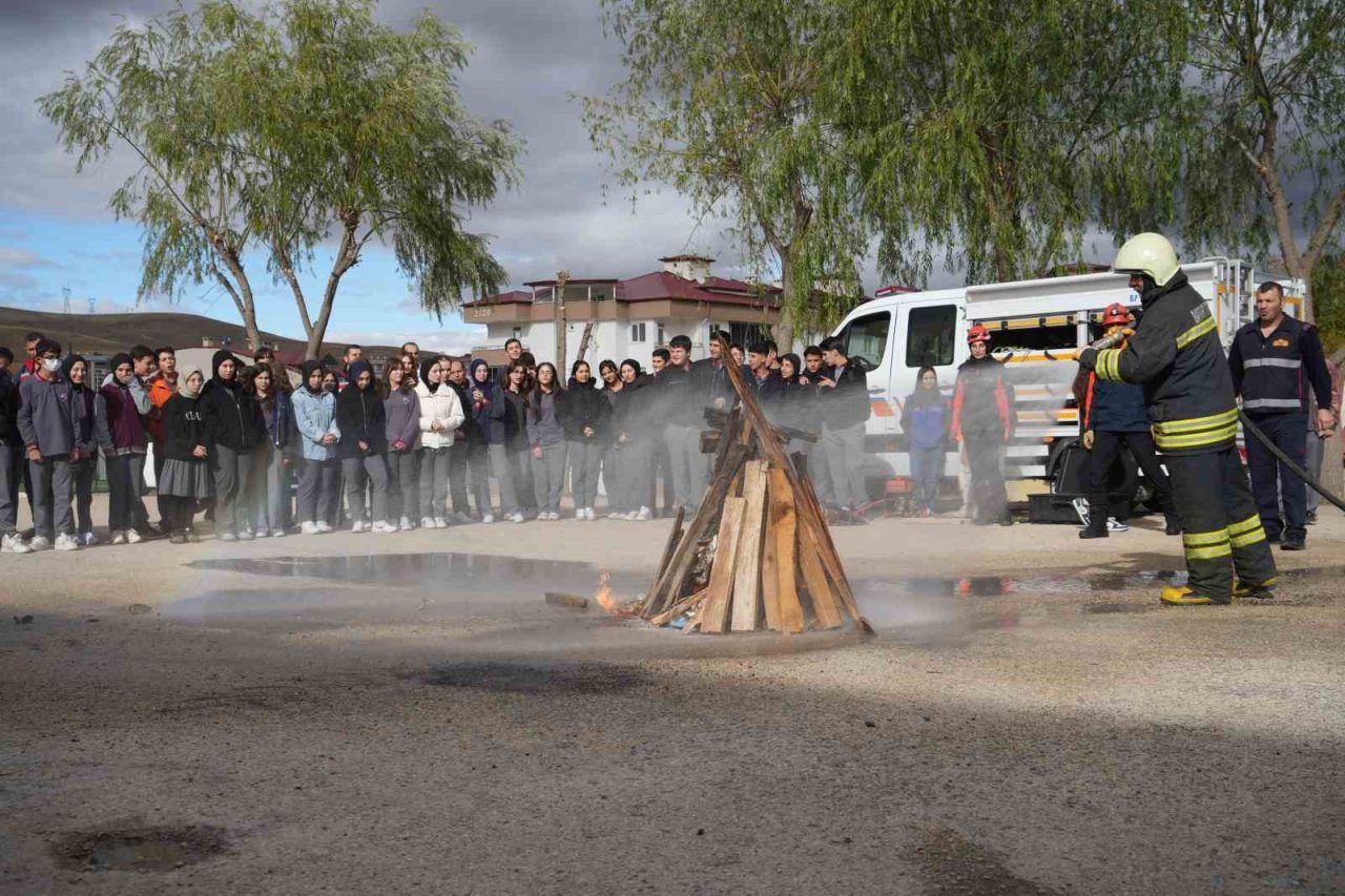 Deprem tatbikatının ardından itfaiye ekipleri gözetiminde yangın farkındalık eğitimi verildi. Öğrenciler, yangın söndürme tüpleriyle uygulamalı olarak yangına müdahale etti. Su ve köpükle yapılan müdahaleyle yangın kısa sürede söndürüldü, tatbikat başarıyla tamamlandı.