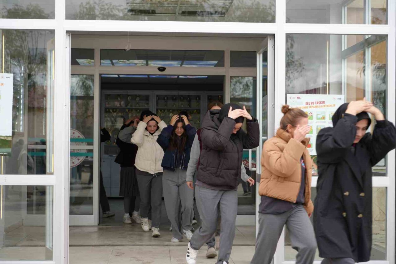 Deprem bilincinin artırılması ve öğrencilerde afet farkındalığının oluşturulması amacıyla düzenlenen tatbikatta, AFAD ve MEM AKUB ekipleri tarafından öğrencilere deprem sırasında ve sonrasında yapılması gerekenler anlatılarak, çök-kapan-tutun hareketi uygulamalı olarak gösterildi.