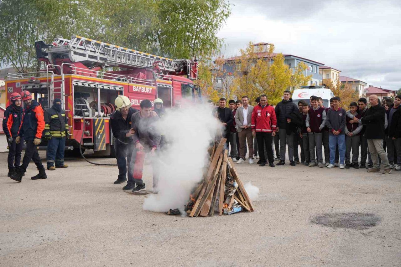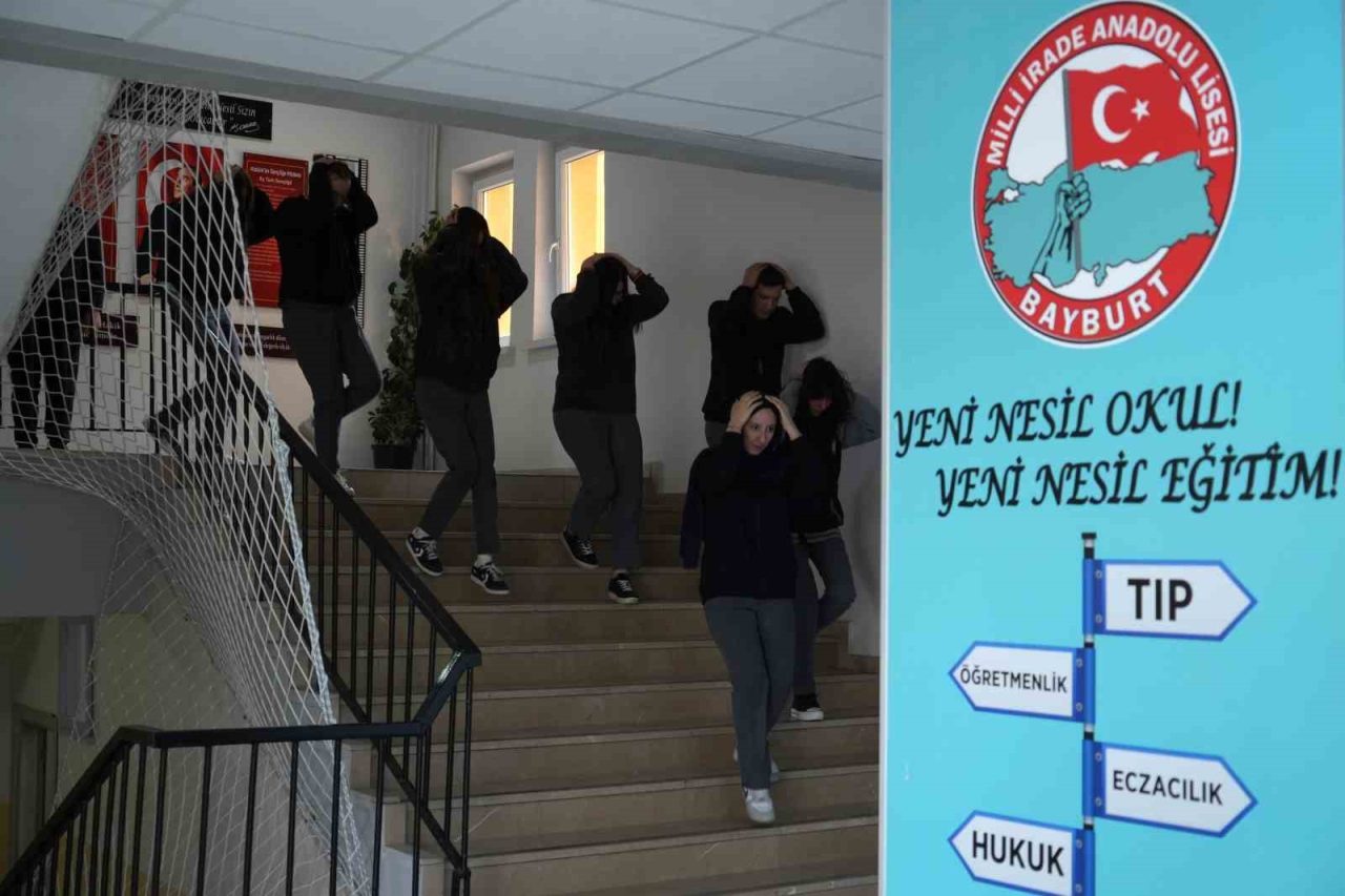 Deprem ve yangın tatbikatı, Bayburt İl Afet ve Acil Durum Müdürlüğü (AFAD) personeli, Ulusal Medikal Kurtarma Ekibi (UMKE), Milli Eğitim Müdürlüğü Arama ve Kurtarma Birimi (MEM AKUB) ve itfaiye ekiplerinin katılımıyla yapıldı.