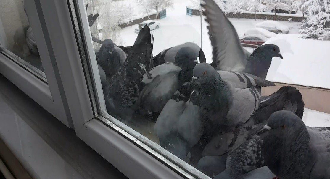 Soğuk hava nedeniyle yiyecek bulmakta zorlanan güvercinler ise pencerelerin önüne bırakılan yemlere akın etti. Bir vatandaşın pencere önüne döktüğü bulgur, aç kalan güvercinlerin sabah kahvaltısı oldu. Pencere önünde toplanan güvercinler, yemlere ulaşabilmek için adeta birbirleriyle yarıştı.