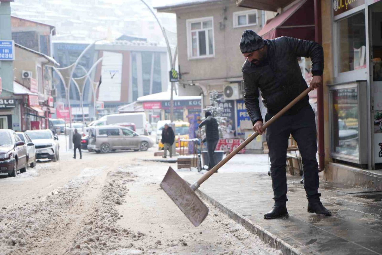 Gece saatlerinde başlayan ve ilerleyen saatlerde etkisini azaltan kar yağışı, sabah saatlerinde yeniden kuvvetlendi. Kent genelinde etkili olan yağış sonrası esnaf, dükkanlarının önünde biriken karları temizleyerek güne başladı.