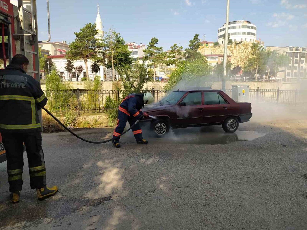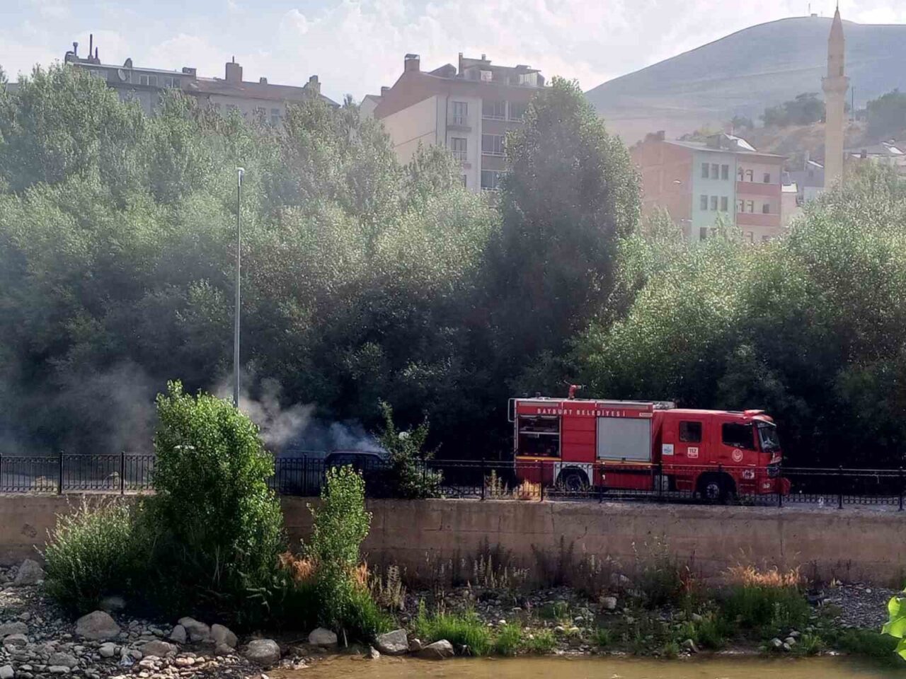 Bayburt’ta Taş Köprü civarında park halinde bulunan bir otomobilde çıkan yangın, itfaiye ekiplerinin hızlı müdahalesiyle söndürüldü. Yangının çıkış sebebinin aracın elektrik aksamındaki bir arızadan kaynaklandığı belirlendi.