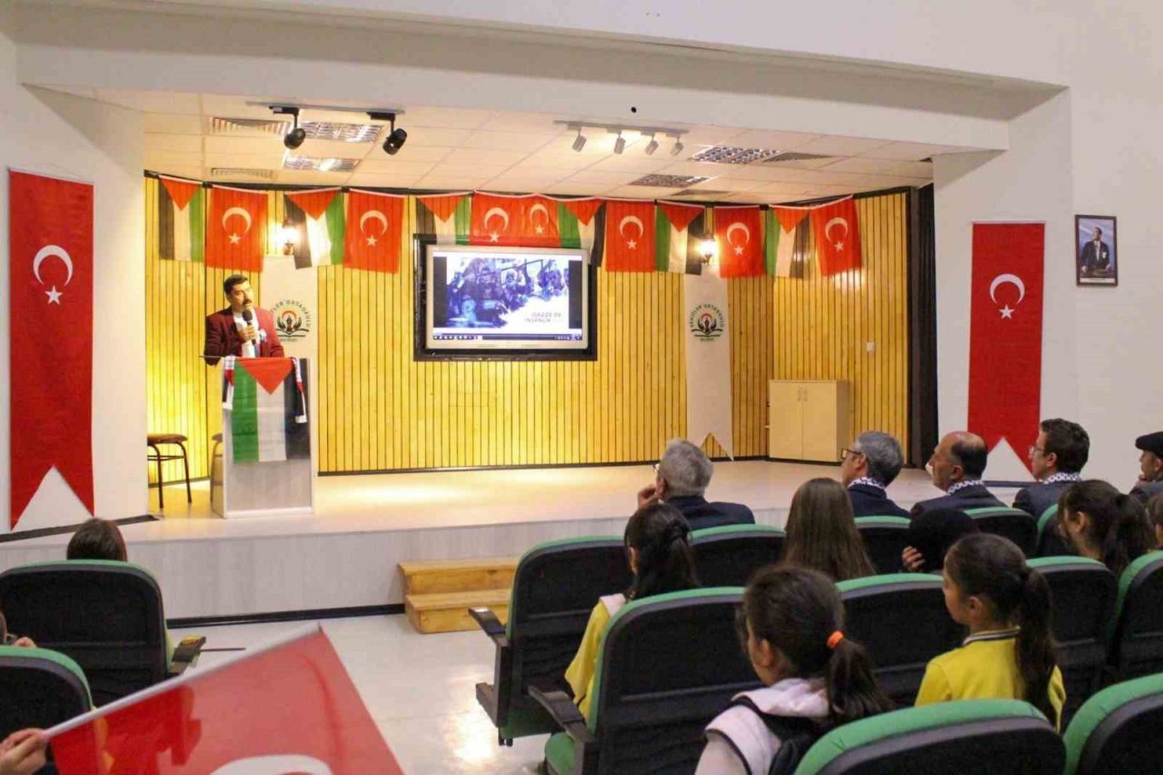 Şehitler Ortaokulu’nda düzenlenen etkinlik kapsamında Din Kültürü ve Ahlak Bilgisi Öğretmeni Abdullah Dursun tarafından ‘Gazze’de Çocuk Olmak’ konulu konferans verildi. Programa katılan İl Millî Eğitim Müdürü Ömer Faruk Kahraman, öğrencilerin ve öğretmenlerin çabasına ortak olarak, ‘Bizim Şarkımız’ adlı şiiri okudu, Filistin halkına desteğini dile getirdi.