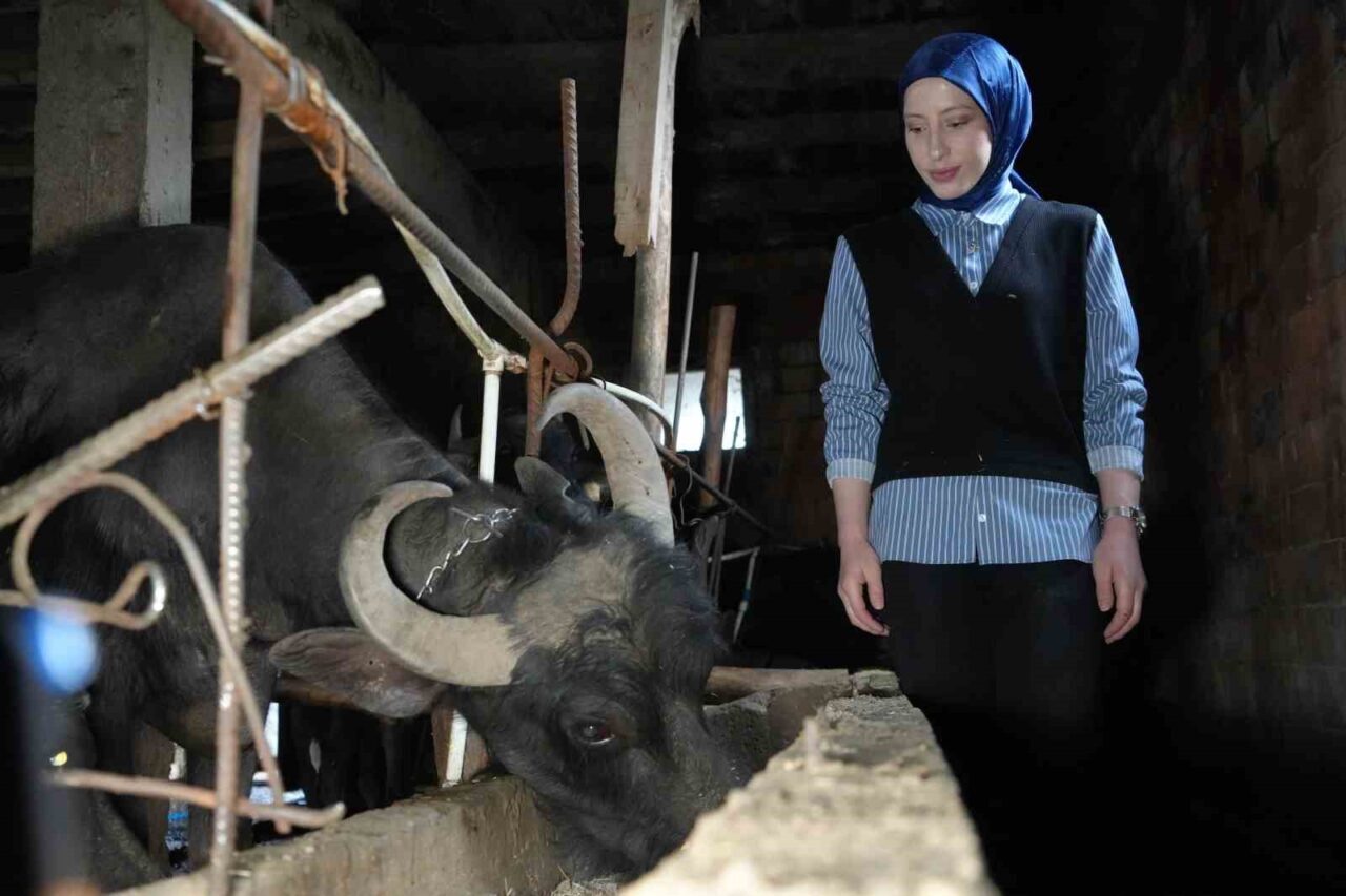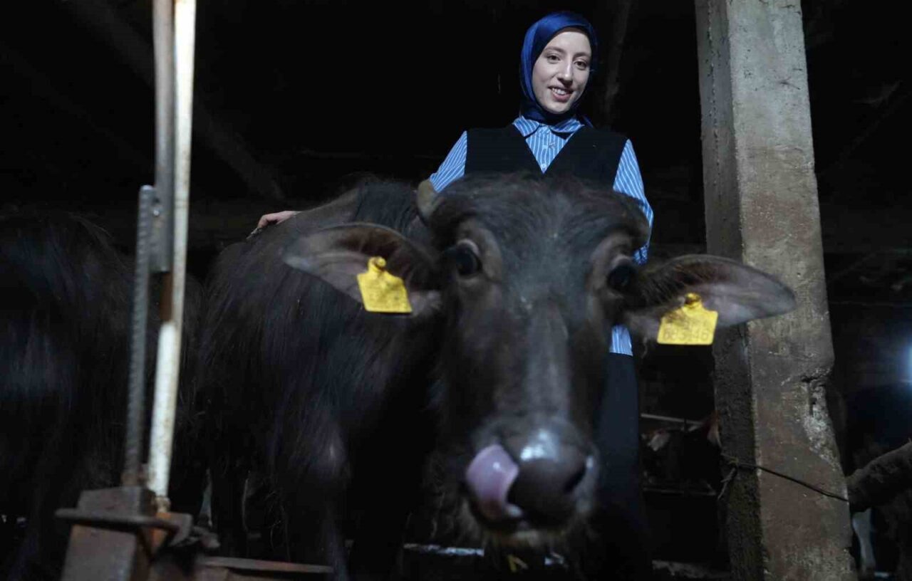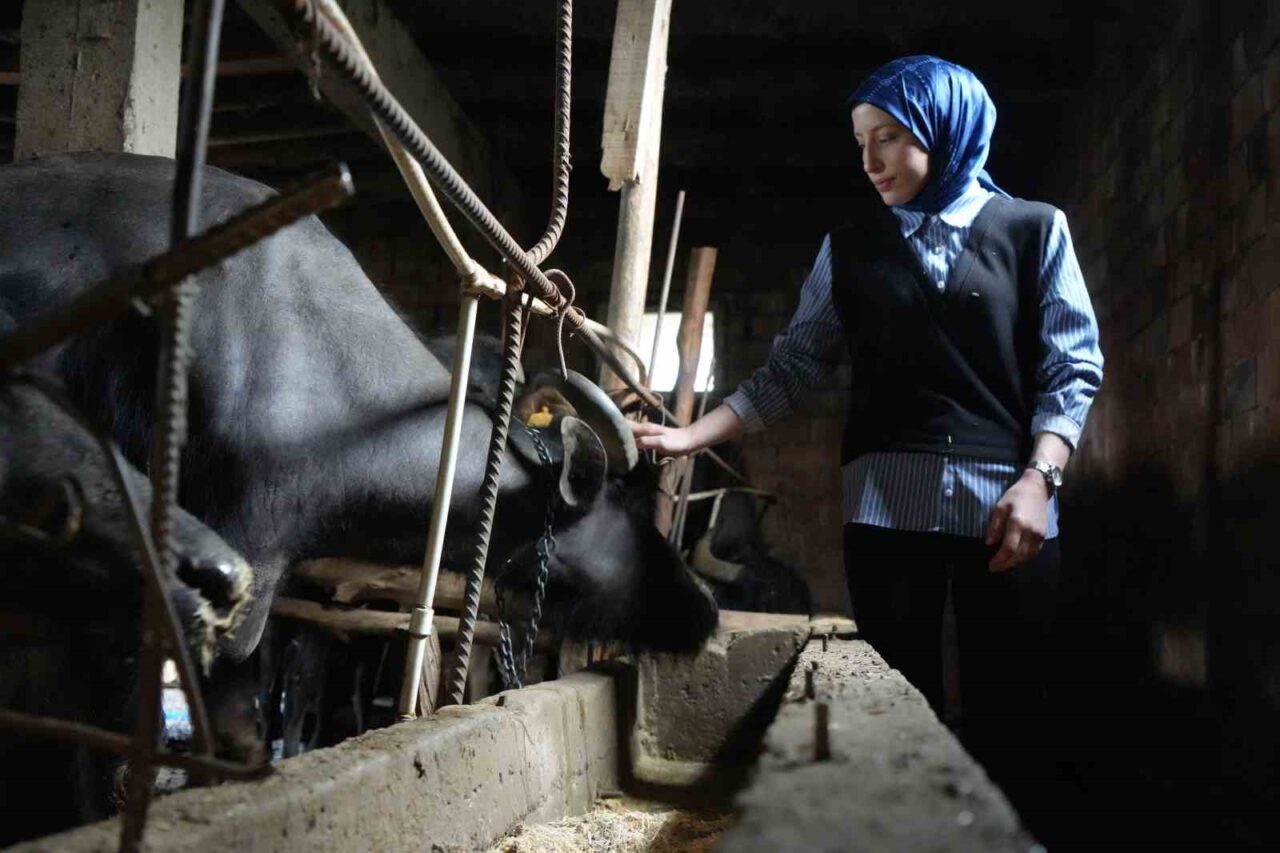 Bayburtlu genç kadın girişimci Şafak Eraslan, devletten aldığı 100 bin liralık hibe desteğiyle manda çiftliği kurarak hem üretime katıldı, hem de ev ekonomisine katkı sağladı.