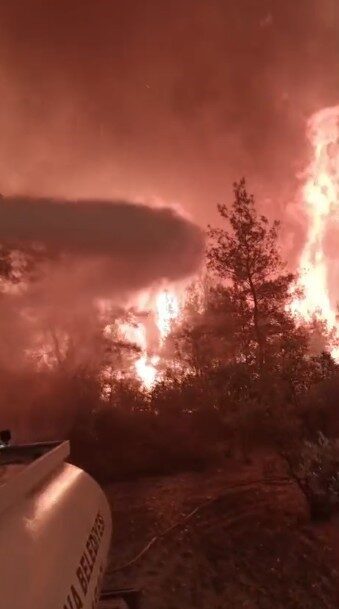 Alevlerin arasında kalan belediye başkanı Akın, “Alevlerin ortasında kaldığımız esnada kollarımız zarar gördü, benim gözüme de bir kül parçası kaçtı onu da çıkaramadık daha sonrasında hastaneye gittim orada ekipler müdahale ettiler sağ olsunlar. Gerçekten orada o alevlere karşı koymak mümkün değil. Bunu canlı olarak orada yaşadım. Ekibimizi oradan çıkarmakta endişe yaşadık. Ama emin olun alevlerin yola inmesi çok hızlı şekilde oldu. Bölgede nemin az olması, rüzgarın fazla olması ve ısının çok yüksek olması yangının tetiklenmesine sebep oluyor. Fakat ekiplerimiz gerçekten hızlı şekilde müdahale etmeye çalışıyor. Tüm ekiplerimiz ile birlikte millette burada. Sağ olsun herkes elinden geleni yapıyor” diye konuştu.