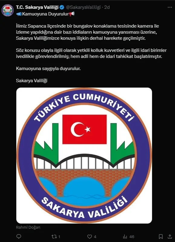 SAKARYA’NIN SAPANCA İLÇESİNDE BİR BUNGALOV İÇERİSİNDE BULUNAN GİZLİ KAMERA SKANDALINA İLİŞKİN SAKARYA VALİLİĞİ’NDEN AÇIKLAMA YAPILDI.