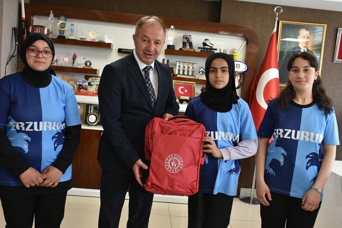 Floor Curlingte Türkiye ikincisi olan Tuzcu Mimar Sinan Ortaokulu’nu tebrik eden Erzurum Gençlik ve Spor İl Müdürü Levent Çakmur, sporculara hediye takdim etti.