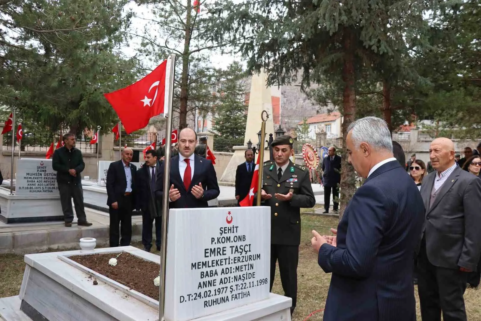Program sabah saatlerinde Oltu Aslan Paşa Şehitliği’nde çelenk sunumuyla başladı. Saygı duruşu ve İstiklal Marşı’nın ardından Topçu Üsteğmen Şakir Civaoğlu açılış konuşması yaptı. Civaoğlu, Çanakkale Zaferi’nin Türk milletinin tarihindeki önemine ve şehitlerin kahramanlıklarına dikkat çekerek, şehitlerimizi anmanın ulusal bir sorumluluk olduğunu vurguladı. Oltu İlçe Müftüsü Veysel Çelebi’nin yaptığı dua sonrası protokol üyeleri şehit mezarlarını ziyaret etti. Oltu Kaymakamı Mustafa Çelik, Garnizon Komutanı Hakan Yay ve Oltu Belediye Başkanı Adem Çelebi, şehit babası Metin Taşçı ile bir araya gelerek, oğlunun şehitlik hikayesini dinlediler. Ardından protokol üyeleri, şehitlerin mezarlarına beyaz karanfiller bıraktı.