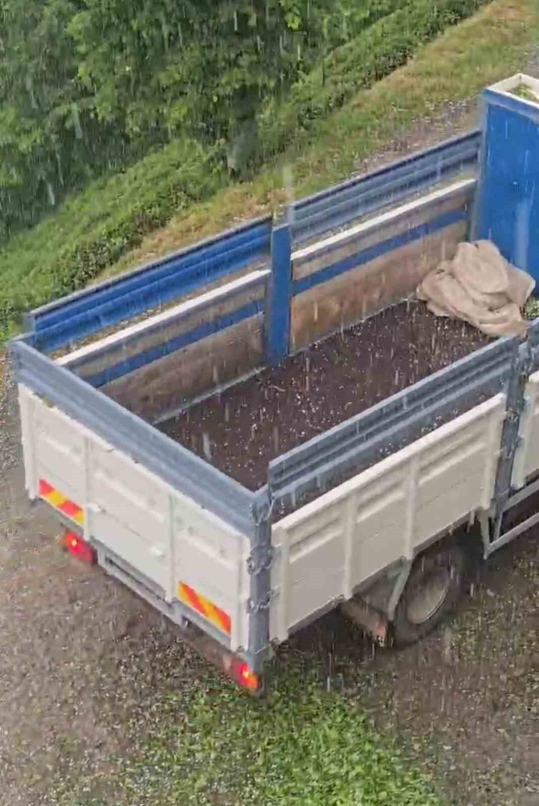 Rize’nin Pazar ilçesinde dolu yağışı üreticilerin çay bahçelerinden kaçışmasına sebep oldu.